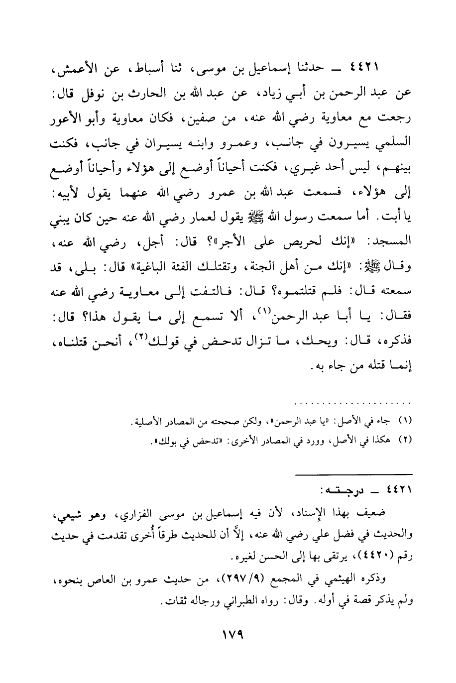 4421 - حَدَّثَنَا إِسْمَاعِيلُ بْنُ مُوسَى، ثنا أَسْبَاطُ، عَنِ الْأَعْمَشِ، عَنْ عَبْدِ الرَّحْمَنِ بْنِ أَبِي زِيَادٍ، عَنْ عَبْدِ اللَّهِ بْنِ الْحَارِثِ بْنِ نَوْفَلٍ قَالَ: رَجَعْتُ مَعَ مُعَاوِيَةَ رَضِيَ الله عَنْه، مِنْ صِفِّينَ، فَكَانَ مُعَاوِيَةُ وَأَبُو الْأَعْوَرِ السُّلَمِيُّ يَسِيرُونَ فِي جَانِبٍ، وَعَمْرٌو وَابْنُهُ يَسِيرَانِ فِي جَانِبٍ، فَكُنْتُ بَيْنَهُمْ، لَيْسَ أَحَدٌ غَيْرِي، فَكُنْتُ أَحْيَانًا أُوضَعُ إِلَى هَؤُلَاءِ وَأَحْيَانًا أُوضَعُ إِلَى هَؤُلَاءِ، فَسَمِعْتُ عَبْدَ اللَّهِ بن عمرو رَضِيَ الله عَنْهما يَقُولُ لِأَبِيهِ: يَا أَبَتِ. أَمَا سَمِعْتَ رَسُولَ اللَّهِ صَلَّى اللَّهُ عَلَيْهِ وَسَلَّمَ يَقُولُ لِعَمَّارٍ رَضِيَ الله عَنْه حِينَ كَانَ يَبْنِي الْمَسْجِدَ: " إِنَّكَ لَحَرِيصٌ عَلَى الْأَجْرِ "؟ قَالَ: أجل، رَضِيَ الله عَنْه، وقال صَلَّى اللَّهُ عَلَيْهِ وَسَلَّمَ: " §إِنَّكَ مِنْ أَهْلِ الْجَنَّةِ، وَتَقْتُلُكَ الْفِئَةُ الْبَاغِيَةُ " قَالَ بَلَى، قَدْ سَمِعْتُهُ قَالَ: فَلِمَ قَتَلْتُمُوهُ؟ قَالَ: فَالْتَفَتَ إِلَى مُعَاوِيَةَ رَضِيَ الله عَنْه فَقَالَ: يَا أَبَا عَبْدِ الرَّحْمَنِ، أَلَا تَسْمَعُ إِلَى مَا يَقُولُ هَذَا؟ قَالَ: فذكره، قال: ويحك، مَا تَزَالُ تدحض في قولك، أَنَحْنُ قَتَلْنَاهُ، إِنَّمَا قَتَلَهُ مَنْ جَاءَ بِهِ.