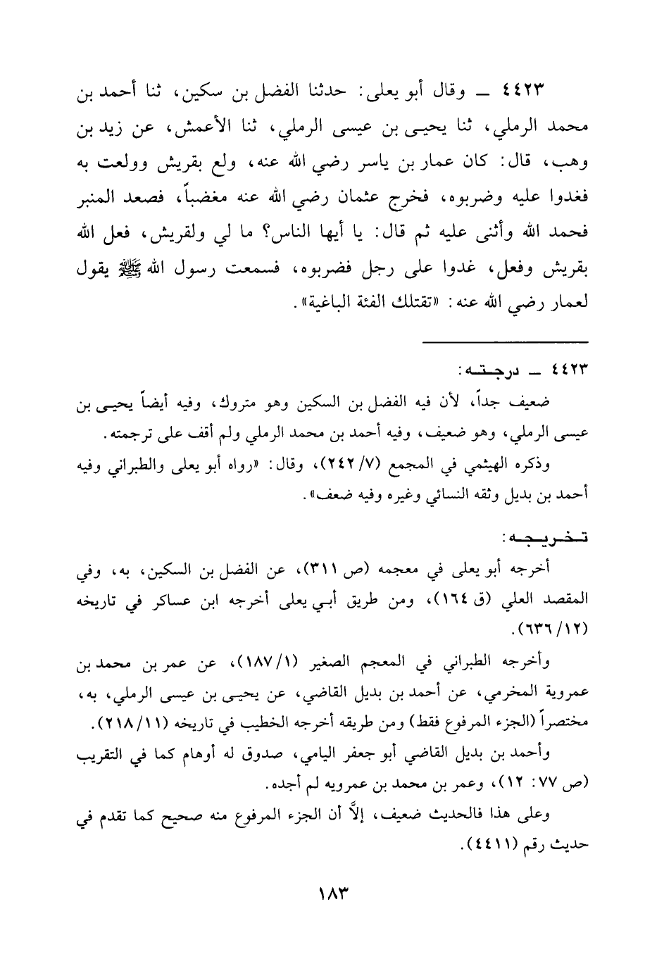 4423 - وَقَالَ أَبُو يَعْلَى: حَدَّثَنَا الفضل بن سكين، ثنا أَحْمَدُ بْنُ مُحَمَّدٍ الرَّمْلِيُّ، ثنا يَحْيَى بْنُ عِيسَى الرَّمْلِيُّ، ثنا الْأَعْمَشُ، عَنْ زَيْدِ بْنِ وَهْبٍ، قَالَ: كَانَ عَمَّارُ بْنُ يَاسِرٍ رَضِيَ الله عَنْه، وَلِعَ بِقُرَيْشٍ وَوَلِعَتْ بِهِ فغدوا عَلَيْهِ وضربوه، فَخَرَجَ عُثْمَانُ رَضِيَ الله عَنْه مُغْضَبًا، فَصَعِدَ الْمِنْبَرَ فَحَمِدَ اللَّهَ وَأَثْنَى عَلَيْهِ ثُمَّ قَالَ: يَا أَيُّهَا النَّاسُ؟ مَا لِي وَلِقُرَيْشٍ، فَعَلَ اللَّهُ بقريش وفعل، غدوا عَلَى رجل فضربوه، فسمعت رَسُولَ اللَّهِ صَلَّى اللَّهُ عَلَيْهِ وَسَلَّمَ يَقُولُ لِعَمَّارٍ رَضِيَ الله عَنْه: " §تَقْتُلُكَ الْفِئَةُ الْبَاغِيَةُ ".