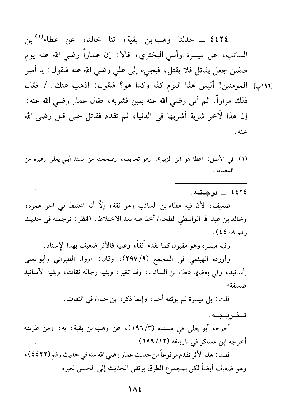 4424 - حَدَّثَنَا وَهْبُ بْنُ بَقِيَّةَ، ثنا خَالِدٌ، عن عطاء بن السائب، عَنْ مَيْسَرَةَ وَأَبِي الْبَخْتَرِيِّ، قَالَا: إِنَّ عَمَّارًا رَضِيَ الله عَنْه يَوْمَ صِفِّينَ جَعَلَ يُقَاتِلُ فَلَا يُقْتَلُ، فَيَجِيءُ إِلَى عَلِيٍّ رَضِيَ الله عَنْه فَيَقُولُ: يَا أَمِيرَ الْمُؤْمِنِينِ! أَلَيْسَ هَذَا الْيَوْمَ كَذَا وَكَذَا هُوَ؟ فَيَقُولُ: أَذْهِبْ عَنْكَ. فَقَالَ ذَلِكَ مِرَارًا، ثُمَّ أُتِيَ رَضِيَ الله عَنْه بِلَبَنٍ فَشَرِبَهُ، فَقَالَ عمار رَضِيَ الله عَنْه: §إن هذا لَآخِرُ شربة أشربها في الدُّنْيَا، ثُمَّ تَقَدَّمَ فَقَاتَلَ حَتَّى قُتِلَ رَضِيَ الله عَنْه.