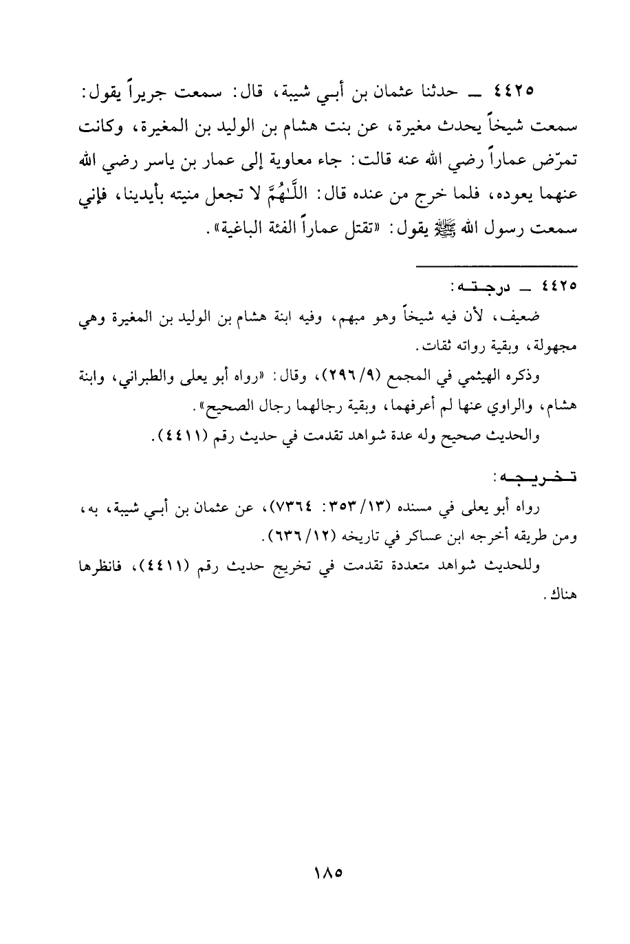4425 - حَدَّثَنَا عُثْمَانُ بْنُ أَبِي شَيْبَةَ، قال: سَمِعْتُ جَرِيرًا يَقُولُ: سَمِعْتُ شَيْخًا يُحَدِّثُ مُغِيرَةَ، عَنْ بِنْتِ هِشَامِ بْنِ الْوَلِيدِ بْنِ الْمُغِيرَةِ، وَكَانَتْ تُمَرِّضُ عَمَّارًا رَضِيَ الله عَنْه قَالَتْ: جَاءَ مُعَاوِيَةُ إِلَى عمار بن ياسر رَضِيَ الله عَنْهما يَعُودُهُ، فَلَمَّا خَرَجَ مِنْ عِنْدِهِ قَالَ: اللَّهُمَّ لَا تَجْعَلْ مَنِيَّتَهُ بِأَيْدِينَا، فَإِنِّي سَمِعْتُ رَسُولَ اللَّهِ صَلَّى اللَّهُ عَلَيْهِ وَسَلَّمَ يَقُولُ: " §تَقْتُلُ عَمَّارًا الْفِئَةُ الْبَاغِيَةُ ".