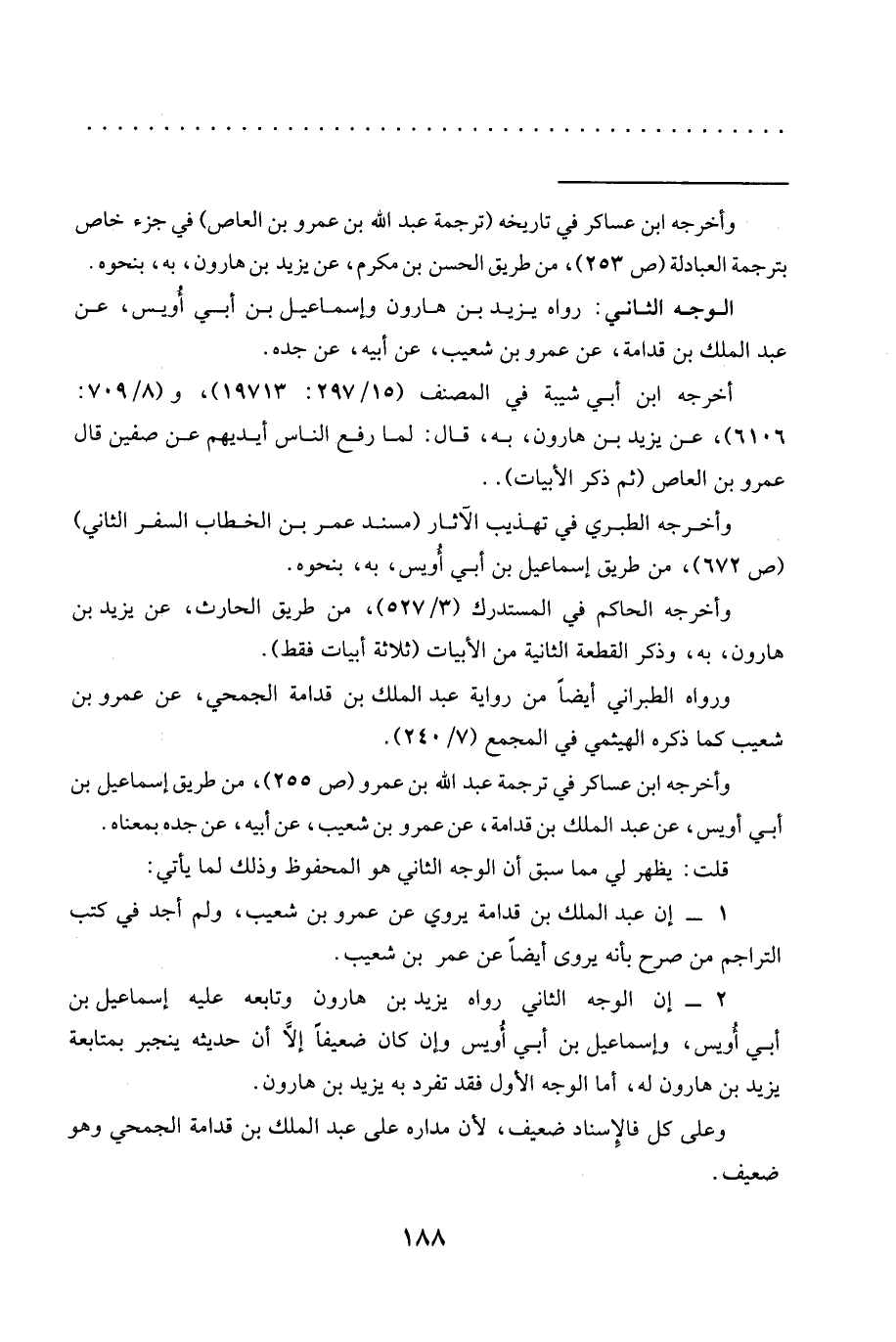 1 - إن عبد الملك بن قدامة يروي عن عمرو بن شعيب، ولم أجد في كتب التراجم من صرح بأنه يروى أيضًا عن عمر بن شعيب.