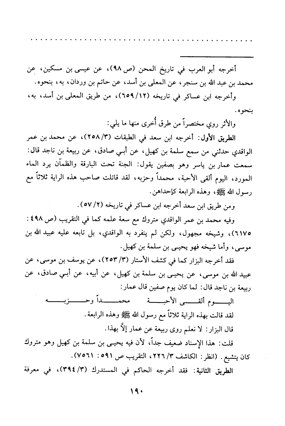 الطريق الأول: أخرجه ابن سعد في الطبقات (3/ 258)، عن محمَّد بن عمر الواقدي حدَّثني من سمع سَلَمَةَ بْنِ كُهَيْلٍ، عَنْ أَبِي صَادِقٍ، عَنْ ربيعة بن ناجد قال: سمعت عمار بن ياسر وهو بصفين يقول: الجنة تحت البارقة والظمآن يرد الماء المورد، اليوم ألقى الأحبة، محمدًا وحزبه، لقد قاتلت صاحب هذه الراية ثلاثًا مَعَ رَسُولِ اللَّهِ -صَلَّى اللَّهُ عَلَيْهِ وَسَلَّمَ-، وهذه الرابعة كإحداهن.
