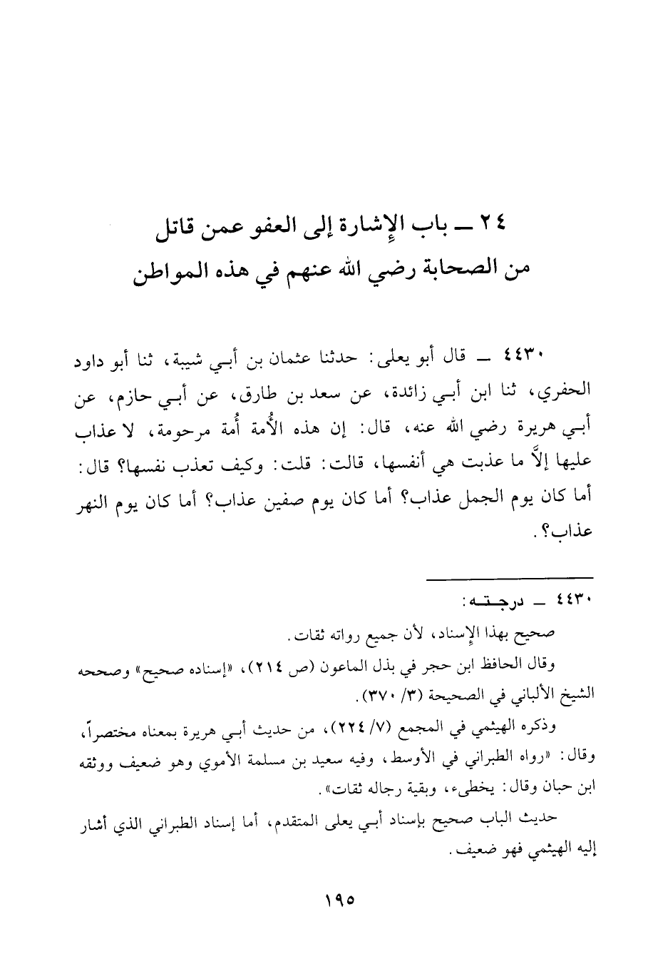 4430 - قَالَ أَبُو يَعْلَى: حَدَّثَنَا عُثْمَانُ بْنُ أَبِي شَيْبَةَ، ثنا أَبُو دَاوُدَ الْحَفَرِيُّ، ثنا ابْنُ أَبِي زَائِدَةَ، عَنْ سَعْدِ بْنِ طَارِقٍ، عَنْ أَبِي حَازِمٍ، عَنْ أَبِي هُرَيْرَةَ رَضِيَ الله عَنْه، قَالَ: إِنَّ §هَذِهِ الْأُمَّةَ أُمَّةٌ مَرْحُومَةٌ، لَا عَذَابَ عَلَيْهَا إِلَّا مَا عَذَّبَتْ هي أنفسها، قالت: قُلْتُ: وَكَيْفَ تُعَذِّبُ نفسها؟ قَالَ: أَمَا كَانَ يوم الجمل عذاب؟ أَمَا كَانَ يوم صفين عذاب؟ أَمَا كَانَ يوم النهر عذاب؟ .