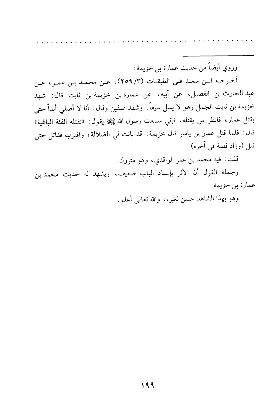 أخرجه ابن سعد في الطبقات (3/ 259)، عن محمَّد بن عمر، عن عبد الحارث بن الفضيل، عن أبيه، عن عمارة بن خزيمة بن ثابت قال: شهد خزيمة بن ثابت الجمل وهو لا يسل سيفًا. وشهد صفين وقال: أنا لا أصلي أبدًا حتى يقتل عمار، فانظر من يقتله، فَإِنِّي سَمِعْتُ رَسُولَ اللَّهِ -صَلَّى اللَّهُ عَلَيْهِ وسلم- يقول: "تقتله الفئة الباغية" قال: فلما قتل عمار بن ياسر قال خزيمة: قد بانت لي الضلالة، واقترب فقاتل حتى قتل (وزاد قصة في آخره).