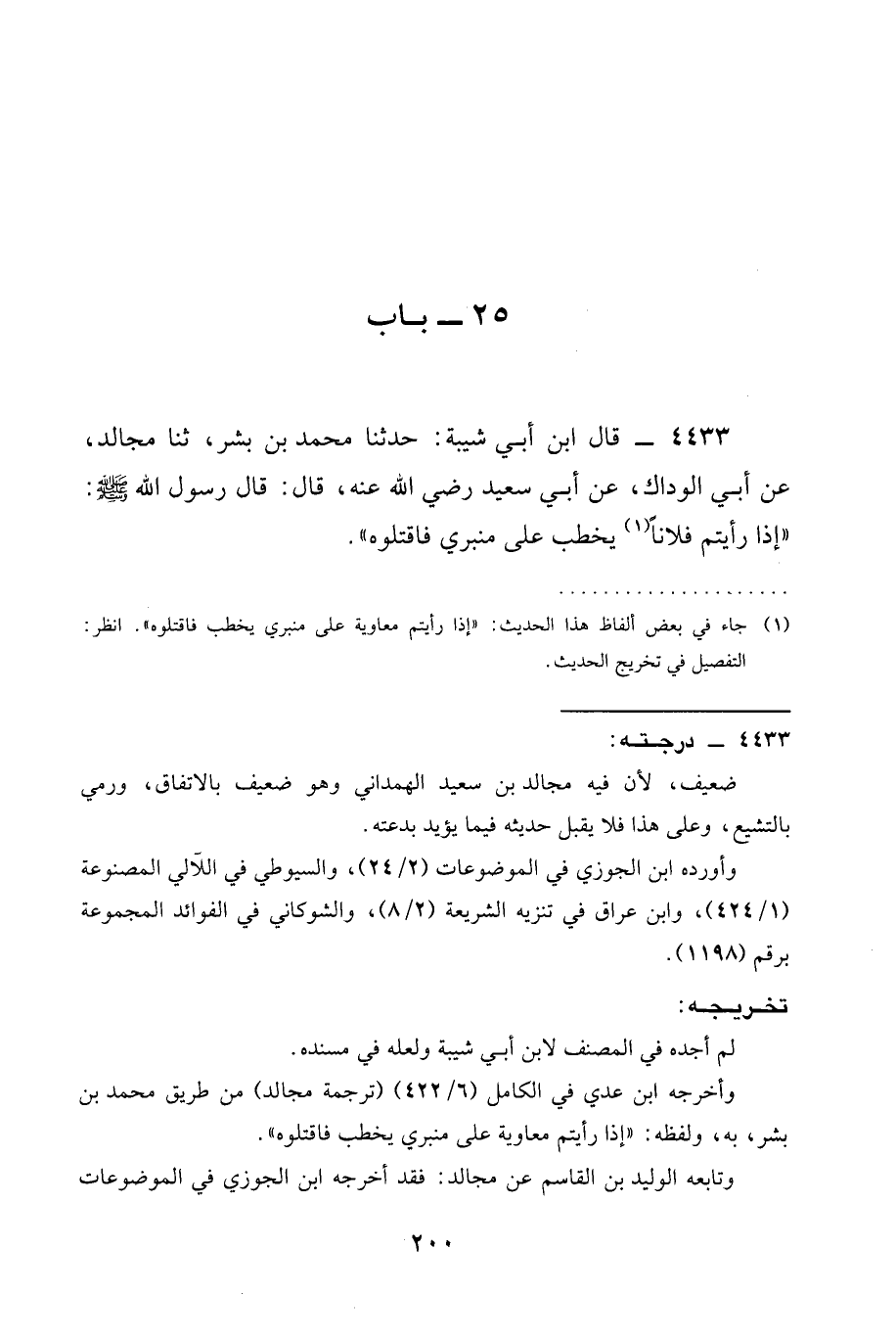 4433 - قال ابْنُ أَبِي شَيْبَةَ: حَدَّثَنَا مُحَمَّدُ بْنُ بِشْرٍ، ثنا مُجَالِدٌ، عَنْ أَبِي الْوَدَّاكِ، عَنْ أَبِي سَعِيدٍ رَضِيَ الله عَنْه، قَالَ: قَالَ رَسُولُ اللَّهِ صَلَّى اللَّهُ عَلَيْهِ وَسَلَّمَ: " §إِذَا رَأَيْتُمْ فُلَانًا يَخْطُبُ عَلَى مِنْبَرِي فَاقْتُلُوهُ ".