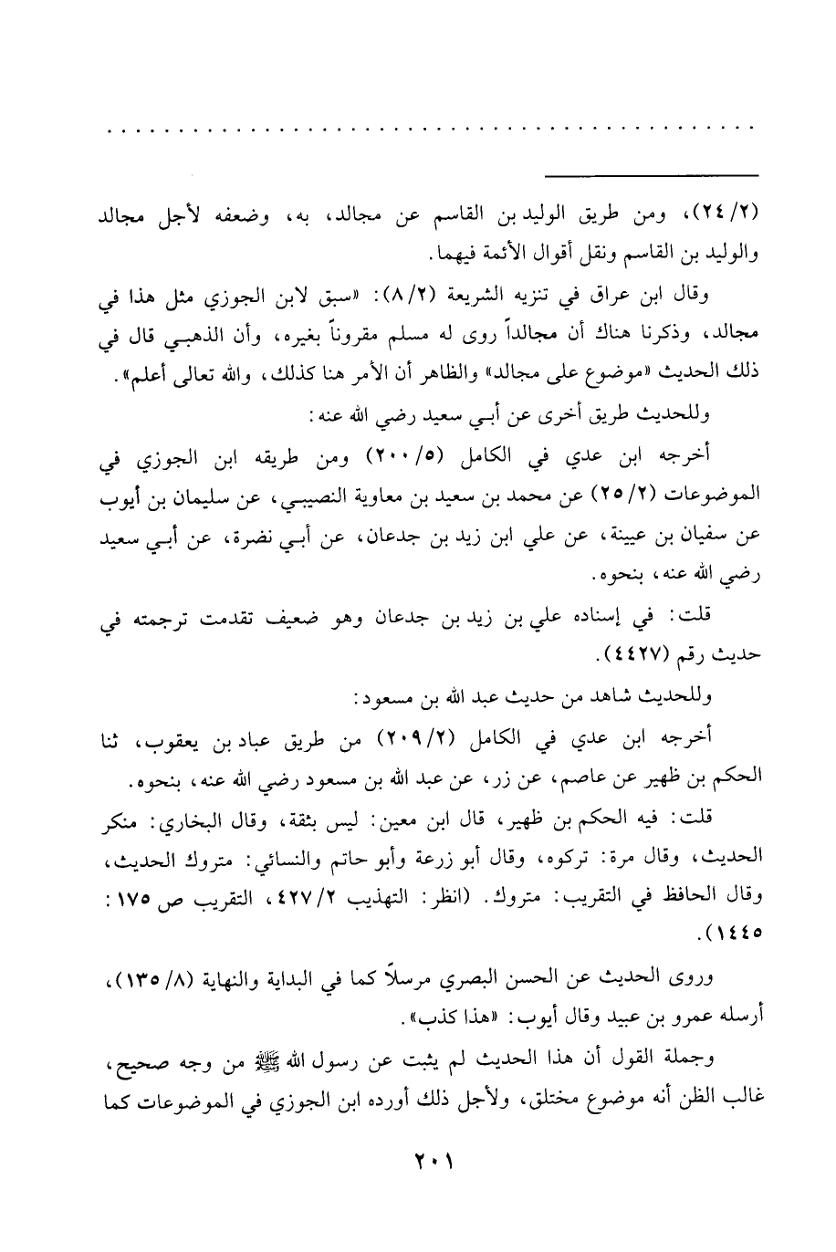 = (2/ 24)، ومن طريق الوليد بن القاسم عن مجالد، به، وضعفه لأجل مجالد والوليد بن القاسم ونقل أقوال الأئمة فيهما.