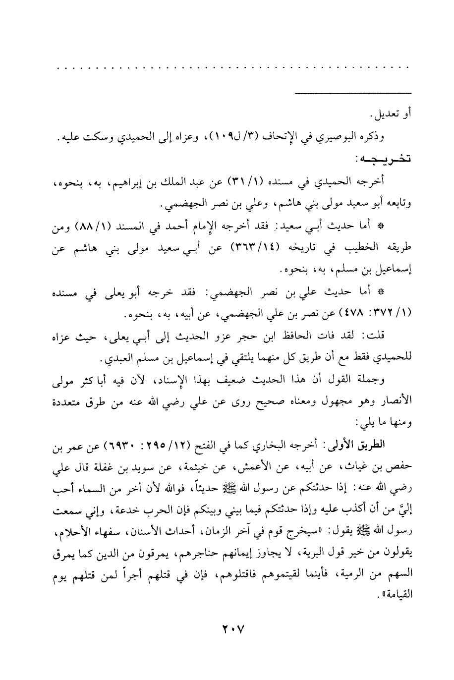الطريق الأولى: أخرجه البخاري كما في الفتح (12/ 295: 6930) عن عمر بن حفص بن غياث، عن أبيه، عن الأعمش، عن خيثمة، عن سويد بن غفلة قال علي رضي الله عنه: إِذَا حدَّثتكم عَنْ رَسُولِ اللَّهِ -صَلَّى اللَّهُ عَلَيْهِ وَسَلَّمَ- حديثًا، فوالله لأن أخر من السماء أحب إليَّ من أن أكذب عليه وإذا حدَّثتكم فيما بيني وبينكم فإن الحرب خدعة، وَإِنِّي سَمِعْتُ رَسُولَ اللَّهِ -صَلَّى اللَّهُ عَلَيْهِ وسلم- يقول: "سيخرج قوم في آخر الزمان، أحداث الأسنان، سفهاء الأحلام، يقولون من خير قول البرية، لا يجاوز إيمانهم حناجرهم، يَمْرُقُونَ مِنَ الدِّينِ كَمَا يَمْرُقُ السَّهْمُ مِنَ الرمية، فأينما لقيتموهم فاقتلوهم، فإن في قتلهم أجرًا لمن قتلهم يوم القيامة". =
