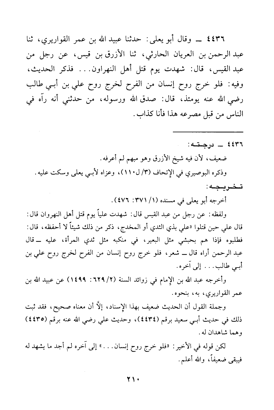 4436 - وَقَالَ أَبُو يَعْلَى: حَدَّثَنَا عُبَيْدُ اللَّهِ بْنُ عُمَرَ الْقَوَارِيرِيُّ، ثنا عَبْدُ الرَّحْمَنِ بْنُ الْعُرْيَانِ الْحَارِثِيُّ، ثنا الْأَزْرَقُ بْنُ قَيْسٍ، عَنْ رَجُلٍ مِنْ عَبْدِ الْقَيْسِ، قَالَ: شَهِدْتُ يَوْمَ قُتِلَ أَهْلُ النهراون ... فَذَكَرَ الْحَدِيثَ، وَفِيهِ: §فَلَوْ خَرَجَ رُوحُ إِنْسَانٍ مِنَ الْفَرَحِ لَخَرَجَ رُوحُ عَلِيِّ بْنِ أَبِي طَالِبٍ رَضِيَ الله عَنْه يَوْمَئِذٍ، قَالَ: صَدَقَ اللَّهُ وَرَسُولُهُ، مَنْ حَدَّثَنِي أَنَّهُ رَآهُ فِي النَّاسِ مِنْ قَبْلِ مَصْرَعِهِ هَذَا فَأَنَا كَذَّابٌ.