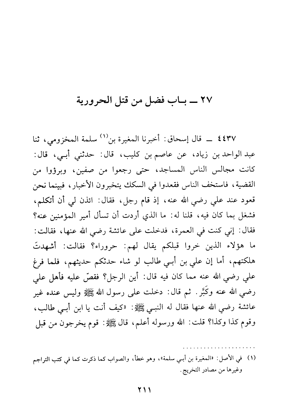 4437 - قال إسحاق: أخبرنا الْمُغِيرَةُ بْنُ سَلَمَةَ الْمَخْزُومِيُّ، ثنا عَبْدُ الْوَاحِدِ بْنُ زِيَادٍ، عَنْ عَاصِمِ بْنِ كُلَيْبٍ، قَالَ: حَدَّثَنِي أَبِي، قَالَ: كَانَتْ مَجَالِسُ النَّاسِ الْمَسَاجِدَ، حَتَّى رَجَعُوا مِنْ صِفِّينَ، وبرؤوا مِنَ الْقَضِيَّةِ، فَاسْتَخَفَّ النَّاسُ فقعدوا فِي السِّكَكِ يَتَخَبَّرُونَ الْأَخْبَارَ، فَبَيْنَمَا نَحْنُ قُعُودٌ عِنْدَ عَلِيٍّ رَضِيَ الله عَنْه، إِذْ قَامَ رَجُلٌ، فَقَالَ: ائْذَنْ لِي أَنْ أَتَكَلَّمَ، فَشُغِلَ بِمَا كَانَ فِيهِ، قُلْنَا لَهُ: مَا الَّذِي أَرَدْتَ أَنْ تَسْأَلَ أَمِيرَ الْمُؤْمِنِينَ عَنْهُ؟ فَقَالَ: إِنِّي كُنْتُ فِي الْعُمْرَةِ، فَدَخَلْتُ على عائشة رَضِيَ الله عَنْها، فَقَالَتْ: مَا هَؤُلَاءِ الَّذِينَ خروا قِبَلَكُمْ يُقَالُ لَهُمْ: حَرُورَاءُ؟ [[فَقُلْتُ: قَوْمٌ خَرَجُوا إِلَى أَرْضِ قَرْيَةٍ قَرِيبَةٍ مِنَّا يُقَالُ لَهَا حَرُورَاءُ]] (*) فَقَالَتْ: أَشَهِدْتَ هَلَكَتَهُمْ، أَمَا إن علي بن أَبِي طَالِبٍ لَوْ شَاءَ حَدَّثَكُمْ حَدِيثَهُمْ، فَلَمَّا فَرَغَ عَلِيٌّ رَضِيَ الله عَنْه مِمَّا كَانَ فِيهِ قَالَ: أَيْنَ الرَّجُلُ؟ فَقَصَّ عَلَيْهِ فَأَهَلَّ عَلِيٌّ رَضِيَ الله عَنْه وَكَبَّرَ. ثُمَّ قَالَ: دَخَلْتُ عَلَى رَسُولِ اللَّهِ صَلَّى اللَّهُ عَلَيْهِ وَسَلَّمَ وَلَيْسَ عِنْدَهُ غير عائشة رَضِيَ الله عَنْها فقال له النَّبِيُّ صَلَّى اللَّهُ عَلَيْهِ وَسَلَّمَ: " كَيْفَ أَنْتَ يَا ابْنَ أَبِي طَالِبٍ، وَقَوْمُ كَذَا وَكَذَا؟ قُلْتُ: اللَّهُ وَرَسُولُهُ أَعْلَمُ، قَالَ صَلَّى اللَّهُ عَلَيْهِ وَسَلَّمَ: §قَوْمٌ يَخْرُجُونَ مِنْ قِبَلِ
