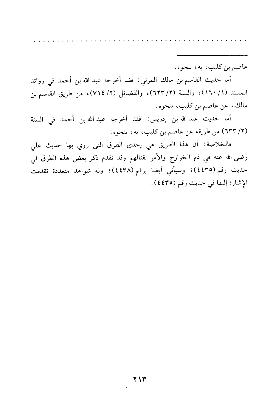 فالخلاصة: أن هذا الطريق هي إحدى الطرق التي روي بها حديث علي رضي الله عنه في ذم الخوارج والأمر بقتالهم وقد تقدم ذكر بعض هذه الطرق في حديث رقم (4435)؛ وسيأتي أيضًا برقم (4438)؛ وله شواهد متعددة تقدمت الإِشارة إليها في حديث رقم (4435).