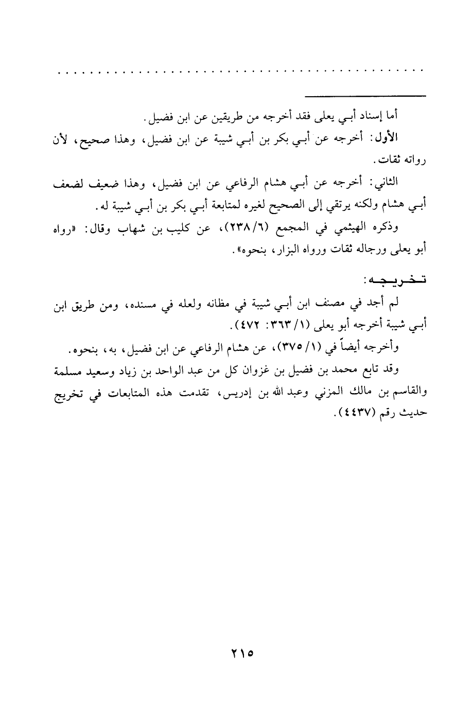 الثاني: أخرجه عن أبي هشام الرفاعي عن ابن فضيل، وهذا ضعيف لضعف أبي هشام ولكنه يرتقي إلى الصحيح لغيره لمتابعة أبي بكر بن أبي شيبة له.
