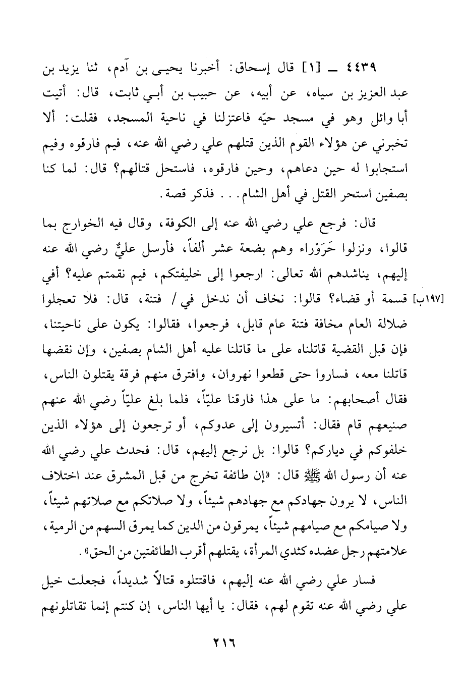 4439 -[1] قال إِسْحَاقُ: أخبرنا يَحْيَى بْنُ آدَمَ، ثنا يَزِيدُ بْنُ عَبْدِ الْعَزِيزِ بْنِ سِيَاهٍ، عَنْ أَبِيهِ، عَنْ حَبِيبِ بْنِ أَبِي ثَابِتٍ، قَالَ: أَتَيْتُ أَبَا وَائِلٍ وَهُوَ فِي مَسْجِدِ حَيِّهِ فَاعْتَزَلْنَا فِي نَاحِيَةِ الْمَسْجِدِ، فَقُلْتُ: أَلَا تُخْبِرُنِي عَنْ هَؤُلَاءِ الْقَوْمِ الَّذِينَ قَتَلَهُمْ عَلِيُّ رَضِيَ الله عَنْه، فيم فارقوه وفيم اسْتَجَابُوا لَهُ حِينَ دَعَاهُمْ، وَحِينَ فَارَقُوهُ، فَاسْتَحَلَّ قِتَالَهُمْ؟ قَالَ: لَمَّا كُنَّا بِصِفِّينَ اسْتَحَرَّ الْقَتْلُ فِي أَهْلِ الشَّامِ ... فَذَكَرَ قِصَّةً.