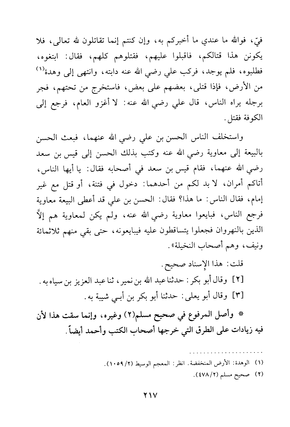 واستخلف الناس الحسن بن علي رضي الله عنهما، فبعث الحسن بالبيعة إلى معاوية رضي الله عنه وَكَتَبَ بِذَلِكَ الْحَسَنُ إِلَى قَيْسِ بْنِ سَعْدٍ رضي الله عنهما، فَقَامَ قَيْسُ بْنُ سَعْدٍ فِي أَصْحَابِهِ فَقَالَ: يا أيها الناس، أتاكم أمران، لا بد لكم من أحدهما: دخول في فتنة، أَوْ قَتْلٌ مَعَ غَيْرِ إِمَامٍ، فَقَالَ النَّاسُ: مَا هَذَا؟ فَقَالَ: الْحَسَنُ بْنُ عَلِيٍّ قَدْ أَعْطَى الْبَيْعَةَ مُعَاوِيَةَ فَرَجَعَ النَّاسُ، فَبَايَعُوا مُعَاوِيَةَ رضي الله عنه وَلَمْ يَكُنْ لِمُعَاوِيَةَ هَمٌّ إلَّا الَّذِينَ بِالنَّهْرَوَانِ فَجَعَلُوا يَتَسَاقَطُونَ عَلَيْهِ فَيُبَايِعُونَهُ، حَتَّى بَقِيَ مِنْهُمْ ثَلَاثُمِائَةٍ وَنَيِّفٍ، وَهُمْ أَصْحَابُ النَّخِيلَةِ".