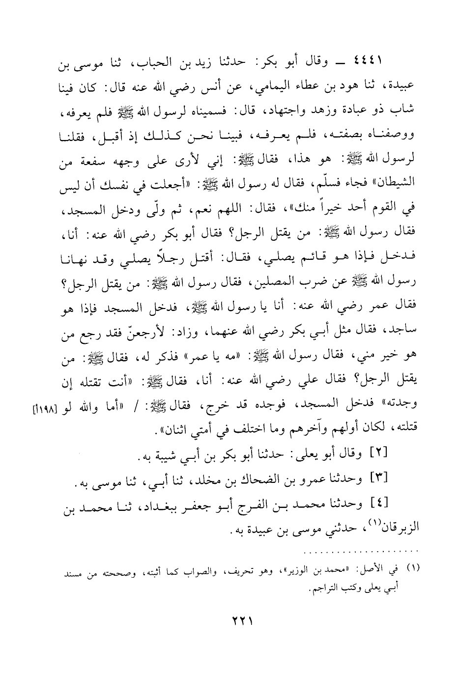 4441 - وَقَالَ أَبُو بَكْرٍ: حَدَّثَنَا زَيْدُ بْنُ الْحُبَابِ، ثنا مُوسَى بْنُ عُبَيْدَةَ، ثنا هُودُ بْنُ عَطَاءٍ اليمامي، عَنْ أَنَسٍ رَضِيَ الله عَنْه قَالَ: كَانَ فِينَا شَابٌّ ذُو عِبَادَةٍ وَزُهْدٍ وَاجْتِهَادٍ، قَالَ: فَسَمَّيْنَاهُ لِرَسُولِ اللَّهِ صَلَّى اللَّهُ عَلَيْهِ وَسَلَّمَ فَلَمْ يَعْرِفْهُ، وَوَصَفْنَاهُ بِصِفَتِهِ، فَلَمْ يَعْرِفْهُ، فَبَيْنَا نَحْنُ كَذَلِكَ إِذْ أقبل، فقلنا لرسول اللَّهِ صَلَّى اللَّهُ عَلَيْهِ وَسَلَّمَ: هُوَ هَذَا، فَقَالَ صَلَّى اللَّهُ عَلَيْهِ وَسَلَّمَ: إِنِّي §لَأَرَى عَلَى وَجْهِهِ سَفْعَةً مِنَ الشَّيْطَانِ " فَجَاءَ فَسَلَّمَ، فَقَالَ لَهُ رَسُولُ اللَّهِ صَلَّى اللَّهُ عَلَيْهِ وَسَلَّمَ: " أَجَعَلْتَ فِي نَفْسِكَ أَنْ لَيْسَ فِي الْقَوْمِ أَحَدٌ خَيْرًا منك "، فقال: اللَّهُمَّ نَعَمْ، ثم ولّى ودخل الْمَسْجِدَ، فَقَالَ رَسُولُ اللَّهِ صَلَّى اللَّهُ عَلَيْهِ وَسَلَّمَ: مَنْ يَقْتُلُ الرَّجُلَ؟ فَقَالَ أَبُو بَكْرٍ رَضِيَ الله عَنْه: أَنَا، فَدَخَلَ فَإِذَا هُوَ قَائِمٌ يُصَلِّي، فَقَالَ: أَقْتُلُ رَجُلًا يُصَلِّي وَقَدْ نَهَانَا رَسُولُ اللَّهِ صَلَّى اللَّهُ عَلَيْهِ وَسَلَّمَ عَنْ ضَرْبِ الْمُصَلِّينَ، فَقَالَ رَسُولُ اللَّهِ صَلَّى اللَّهُ عَلَيْهِ وَسَلَّمَ [[" مَا فَعَلْتَ؟ " قَالَ: كَرِهْتُ أَنْ أَقْتُلَهُ وَهُوَ يُصَلِّي، وَقَدْ نَهَيْتَ عَنْ قَتْلِ الْمُصَلِّينَ. فَقَالَ:]] (*) : مَنْ يَقْتُلُ الرَّجُلَ؟ فَقَالَ عُمَرُ رَضِيَ الله عَنْه: أَنَا يَا رَسُولَ اللَّهِ صَلَّى اللَّهُ عَلَيْهِ وَسَلَّمَ، فَدَخَلَ الْمَسْجِدَ فَإِذَا هُوَ سَاجِدٌ، فَقَالَ مِثْلَ أبي بكر رَضِيَ الله عَنْهما، وَزَادَ: لَأَرْجِعَنَّ فَقَدْ رَجَعَ مَنْ هُوَ خَيْرٌ مِنِّي، فَقَالَ رَسُولُ اللَّهِ صَلَّى اللَّهُ عَلَيْهِ وَسَلَّمَ: " مَهْ يَا عُمَرُ " فَذَكَرَ لَهُ، فَقَالَ صَلَّى اللَّهُ عَلَيْهِ وَسَلَّمَ: مَنْ يَقْتُلُ الرَّجُلَ؟ فَقَالَ عَلِيٌّ رَضِيَ الله عَنْه: أَنَا، فَقَالَ صَلَّى اللَّهُ عَلَيْهِ وَسَلَّمَ: " أَنْتَ تَقْتُلُهُ إِنْ وَجَدْتَهُ " فَدَخَلَ الْمَسْجِدَ، فَوَجَدَهُ قَدْ خَرَجَ، فَقَالَ صَلَّى اللَّهُ عَلَيْهِ وَسَلَّمَ: " أَمَا وَاللَّهِ لَوْ قتلته، لَكَانَ أَوَّلَهُمْ وَآخِرَهُمْ وَمَا اخْتَلَفَ فِي أُمَّتِي اثْنَانِ ".
