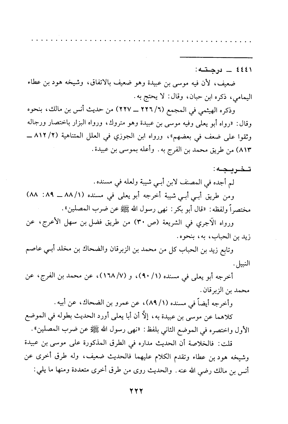 كلاهما عن موسى بن عبيدة به، إلَّا أن أبا يعلى أورد الحديث بطوله في الموضع الأول واختصره في الموضع الثاني بلفظ: "نَهَى رَسُولُ اللَّهِ -صَلَّى اللَّهُ عَلَيْهِ وَسَلَّمَ- عن ضرب المصلين".