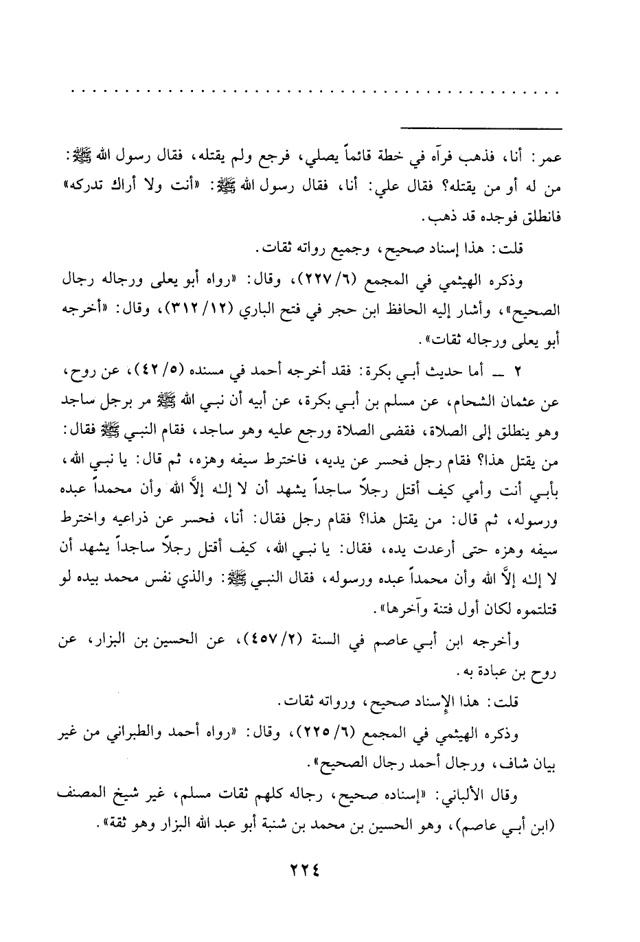 2 - أما حديث أبي بكرة: فقد أخرجه أحمد في مسنده (5/ 42)، عن روح، عن عثمان الشحام، عن مسلم بن أبي بكرة، عن أبيه أن نبي اللَّهِ -صَلَّى اللَّهُ عَلَيْهِ وَسَلَّمَ- مَرَّ بِرَجُلٍ ساجد وهو ينطلق إلى الصلاة، فقضى الصلاة ورجع عليه وهو ساجد، فقام النَّبِيِّ -صَلَّى اللَّهُ عَلَيْهِ وَسَلَّمَ- فَقَالَ: مَنْ يقتل هذا؟ فقام رجل فحسر عن يديه، فاخترط سيفه وهزه، ثم قال: يا نبي الله، بأبي أنت وأمي كيف أقتل رجلًا ساجدًا يشهد أَنْ لَا إِلَهَ إلَّا اللَّهُ وَأَنَّ مُحَمَّدًا عبده ورسوله، ثم قال: من يقتل هذا؟ فقام رجل فقال: أنا، فحسر عن ذراعيه واخترط سيفه وهزه حتى أرعدت يده، فقال: يا نبي الله، كيف أقتل رجلًا ساجدًا يشهد أَنْ لَا إِلَهَ إلَّا اللَّهُ وَأَنَّ مُحَمَّدًا عبده وَرَسُولُهُ، فَقَالَ النَّبِيُّ -صَلَّى اللَّهُ عَلَيْهِ وَسَلَّمَ-: والذي نفس محمَّد بيده لو قتلتموه لكان أول فتنة وآخرها".