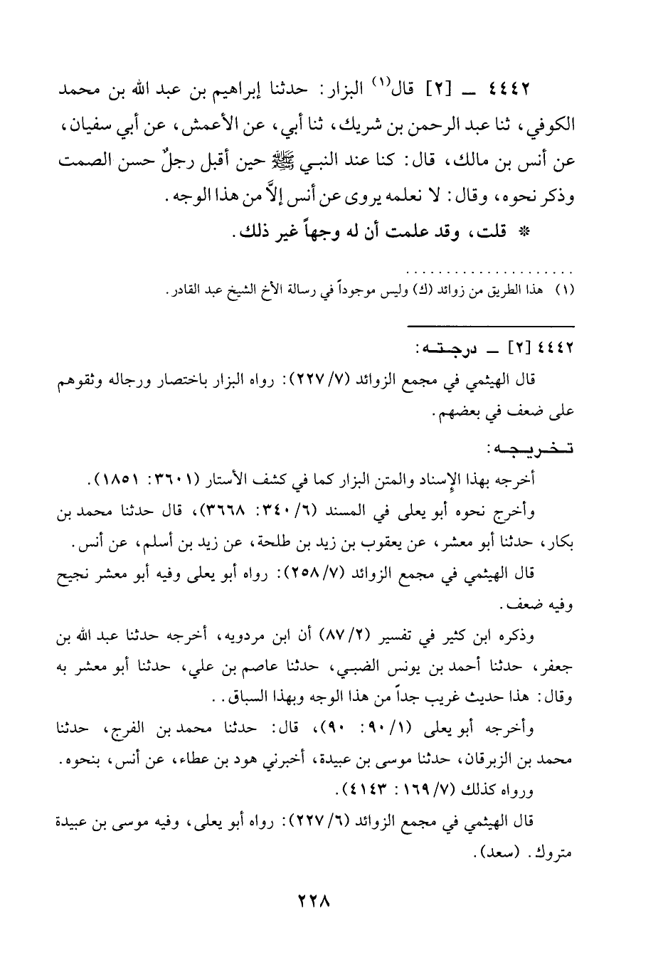 4442 - [2] قال (¬1) الْبَزَّارُ: حدَّثنا إِبْرَاهِيمُ بْنُ عَبْدِ اللَّهِ بْنِ محمَّد الكوفي، ثنا عبد الرحمن بن شريك، ثنا أَبِي، عَنِ الْأَعْمَشِ، عَنْ أَبِي سُفْيَانَ، عَنْ أَنَسِ بْنِ مَالِكٍ، قَالَ: كُنَّا عِنْدَ النَّبِيِّ -صَلَّى اللَّهُ عَلَيْهِ وَسَلَّمَ- حِينَ أَقْبَلَ رجلٌ حسن الصمت