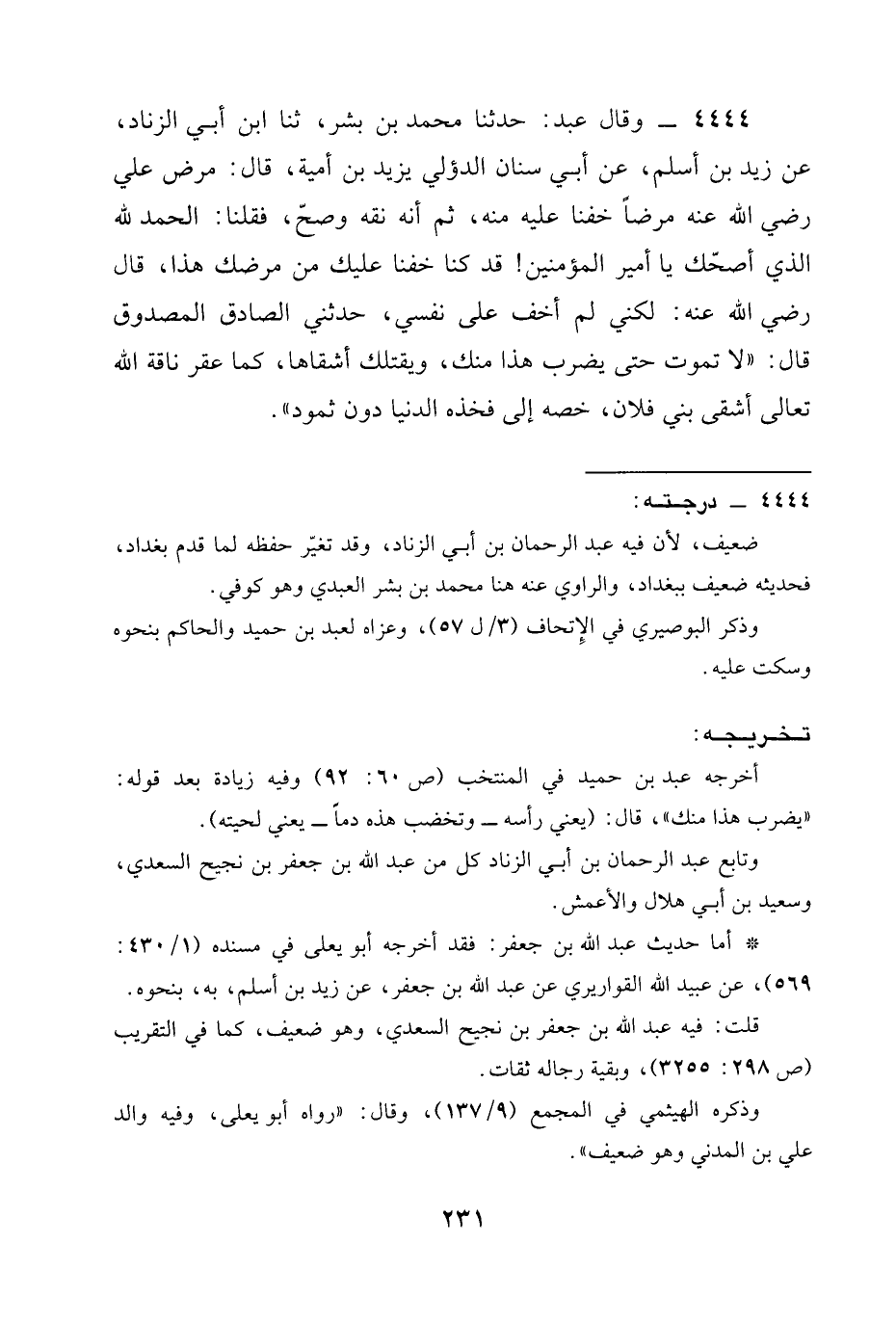 4444 - وَقَالَ عَبْدُ: حَدَّثَنَا مُحَمَّدُ بْنُ بِشْرٍ، ثنا ابْنُ أَبِي الزِّنَادِ، عَنْ زَيْدِ بْنِ أَسْلَمَ، عَنْ أَبِي سِنَانٍ الدُّؤَلِيِّ يَزِيدَ بْنِ أُمَيَّةَ، قَالَ: مَرِضَ عَلِيٌّ رَضِيَ الله عَنْه مَرَضًا خِفْنَا عَلَيْهِ مِنْهُ، ثُمَّ إِنَّهُ نَقِهَ وَصَحَّ، فَقُلْنَا: الْحَمْدُ لِلَّهِ الَّذِي أَصَحَّكَ يَا أَمِيرَ الْمُؤْمِنِينِ! قَدْ كُنَّا خفنا عليك من مَرَضِكَ هَذَا، قَالَ رَضِيَ الله عَنْه: لَكِنِّي لَمْ أَخَفْ عَلَى نَفْسِي، حَدَّثَنِي الصَّادِقُ الْمَصْدُوقُ قَالَ: " §لَا تَمُوتُ حَتَّى يُضْرَبَ هَذَا مِنْكَ، وَيَقْتُلَكَ أَشْقَاهَا، كَمَا عَقَرَ ناقة الله تعالى أَشْقَى بَنِي فُلَانٍ، خَصَّهُ إِلَى فَخِذِهِ الدُّنْيَا دُونَ ثَمُودَ ".