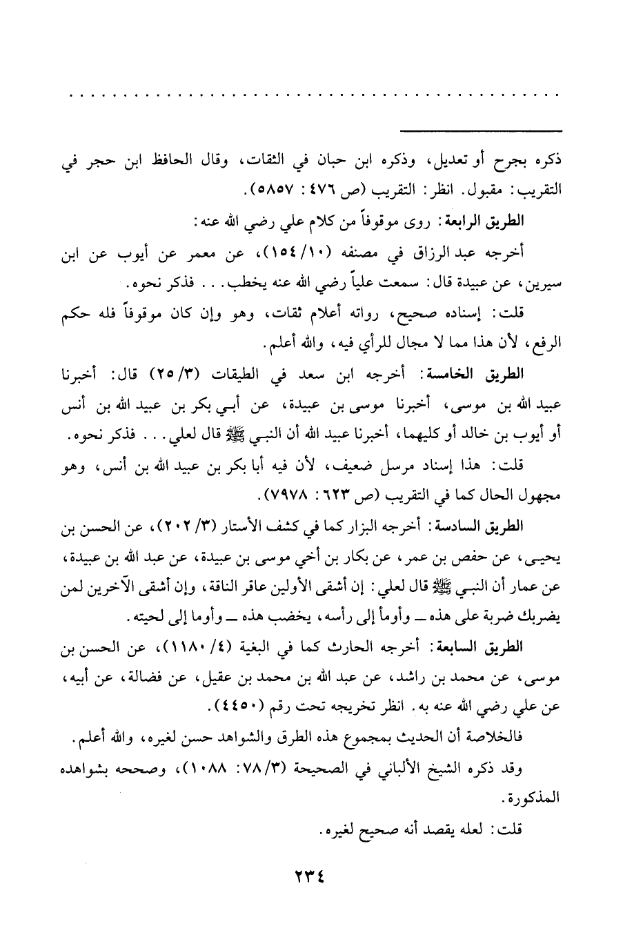 الطريق السابعة: أخرجه الحارث كما في البغية (4/ 180)، عن الحسن بن موسى، عن محمَّد بن راشد، عَنْ عَبْدِ اللَّهِ بْنِ محمَّد بْنِ عَقِيلٍ، عن فضالة، عن أبيه، عن علي رضي الله عنه به. انظر تخريجه تحت رقم (4450).