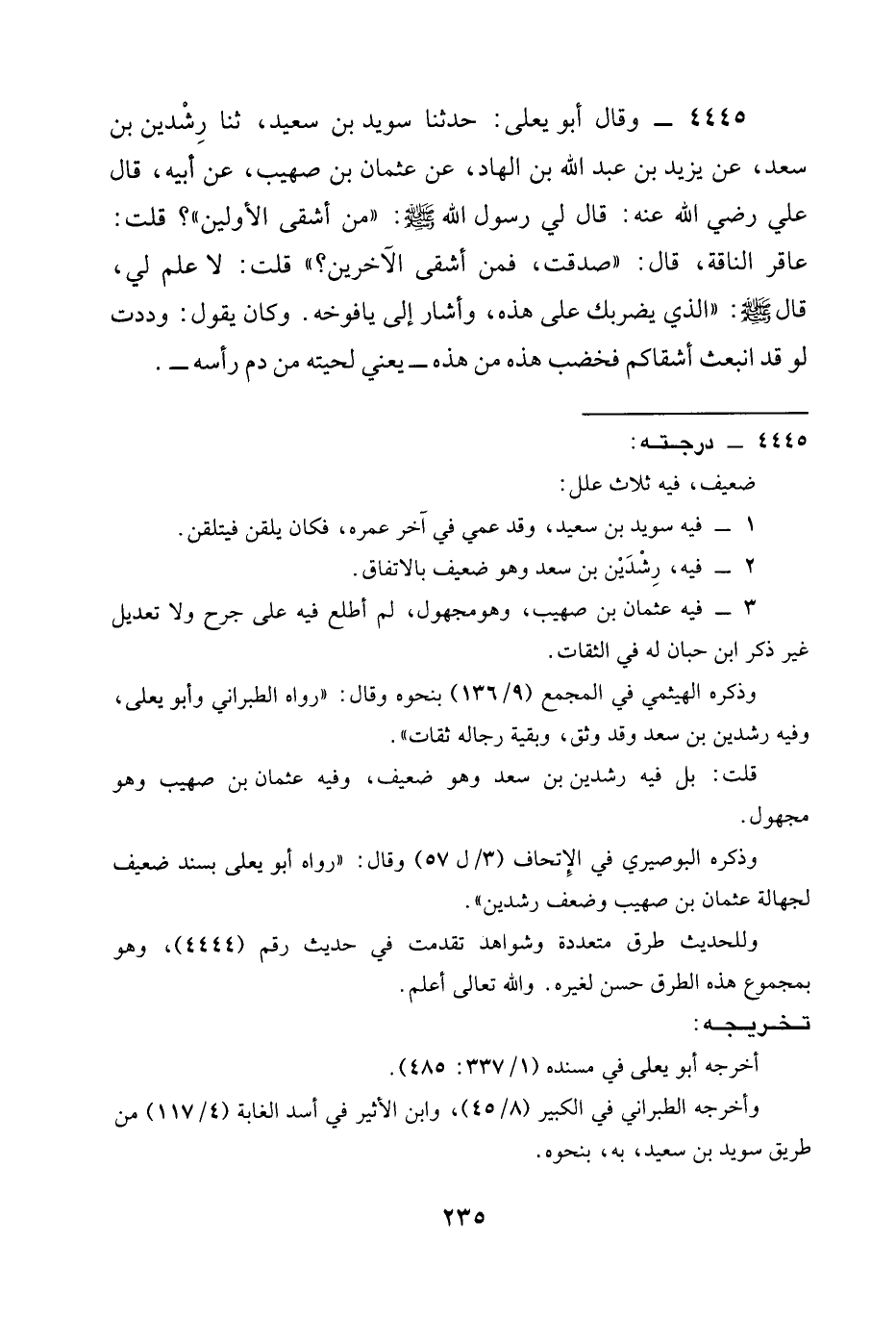 4445 - وَقَالَ أَبُو يَعْلَى: حَدَّثَنَا سُوَيْدُ بْنُ سَعِيدٍ، ثنا رِشْدِينُ بْنُ سَعْدٍ، عَنْ يَزِيدَ بْنِ عَبْدِ اللَّهِ بْنِ الْهَادِ، عَنْ عُثْمَانَ بْنِ صُهَيْبٍ، عَنْ أَبِيهِ، قَالَ عَلِيٌّ رَضِيَ الله عَنْه: قَالَ لِي رَسُولُ اللَّهِ صَلَّى اللَّهُ عَلَيْهِ وَسَلَّمَ: " §مَنْ أَشْقَى الْأَوَّلِينَ "؟ قُلْتُ: عَاقِرُ النَّاقَةِ، قَالَ: " صَدَقْتَ، فَمَنْ أَشْقَى الْآخِرِينَ؟ " قُلْتُ: لَا عِلْمَ لِي، قَالَ صَلَّى اللَّهُ عَلَيْهِ وَسَلَّمَ: " الَّذِي يَضْرِبُكَ عَلَى هذه، وَأَشَارَ إِلَى يَافُوخِهِ. وَكَانَ يَقُولُ: وَدِدْتُ لَوْ قَدِ انْبَعَثَ أَشْقَاكُمْ فَخَضَّبَ هَذِهِ مِنْ هَذِهِ - يَعْنِي لِحْيَتَهُ مِنْ دَمِ رَأْسِهِ -.