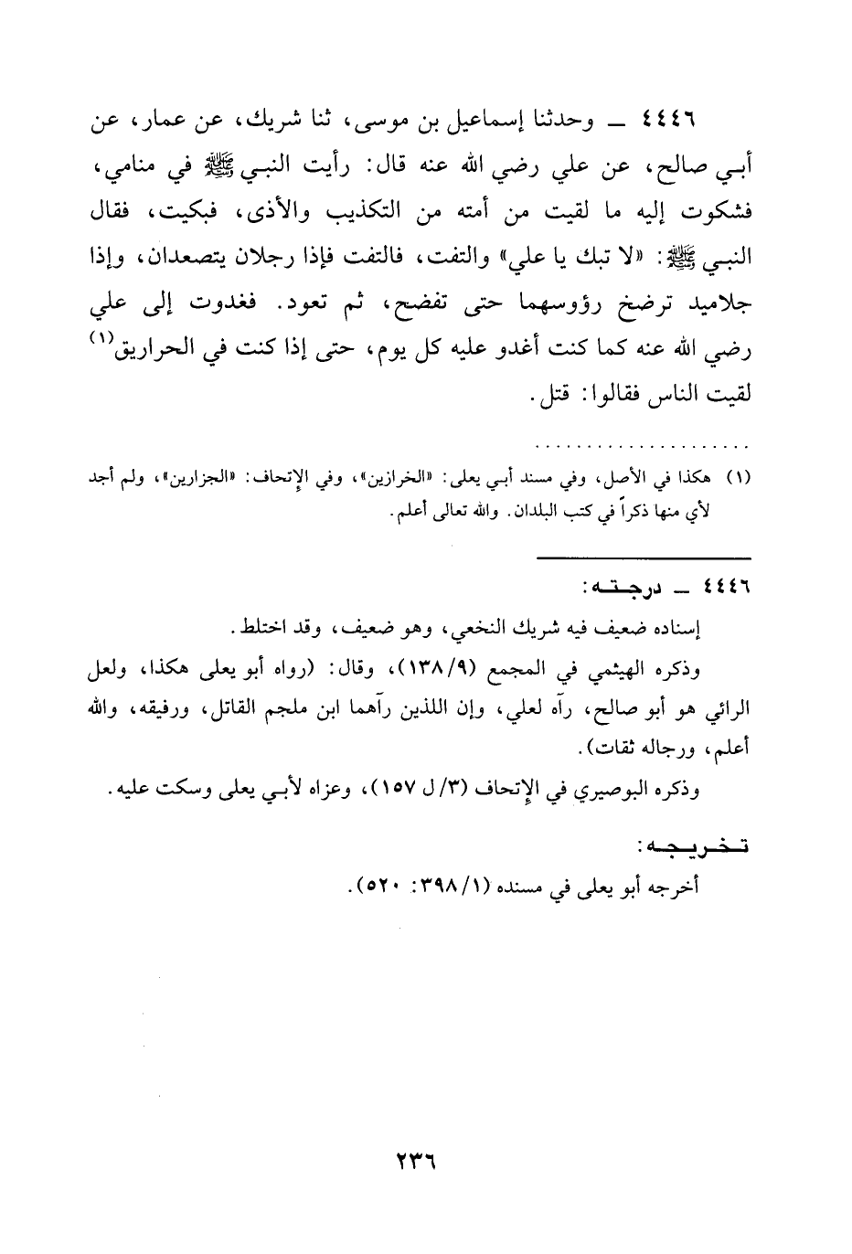4446 - وحدثنا إِسْمَاعِيلُ بْنُ مُوسَى، ثنا شَرِيكٌ، عَنْ عَمَّارٍ، عَنْ أَبِي صَالِحٍ، عَنْ عَلِيٍّ رَضِيَ الله عَنْه قَالَ: رَأَيْتُ النَّبِيَّ صَلَّى اللَّهُ عَلَيْهِ وَسَلَّمَ فِي مَنَامِي، فَشَكَوْتُ إِلَيْهِ مَا لَقِيتُ مِنْ أُمَّتِهِ مِنَ التَّكْذِيبِ وَالْأَذَى، فبكيت، فقال النبي صَلَّى اللَّهُ عَلَيْهِ وَسَلَّمَ: " §لَا تَبْكِ يَا عَلِيُّ " والتفت، فَالْتَفَتُّ فَإِذَا رَجُلَانِ يتصعدان، وإذا جَلَامِيدُ تَرْضَخُ رؤوسهما حتى تفضح، ثُمَّ تَعُودُ. فَغَدَوْتُ إِلَى عَلِيٍّ رَضِيَ الله عَنْه كَمَا كُنْتُ أَغْدُو عَلَيْهِ كُلَّ يَوْمٍ، حَتَّى إِذَا كُنْتُ فِي الْحَرَارِيقِ لَقِيتُ النَّاسَ فَقَالُوا: قُتِلَ.