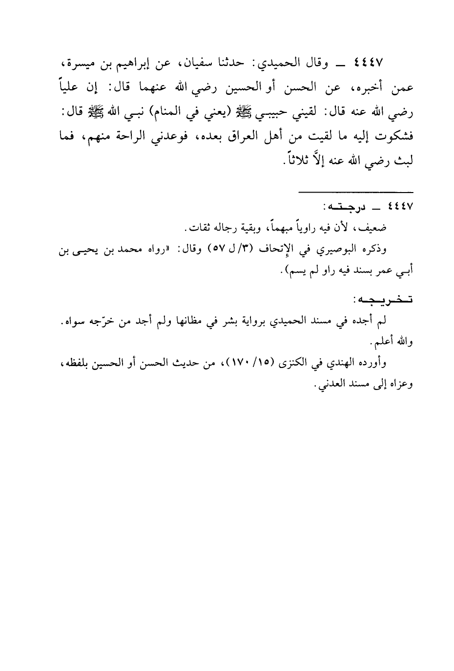 4447 - وَقَالَ الْحُمَيْدِيُّ: حَدَّثَنَا سُفْيَانُ، عَنْ إِبْرَاهِيمَ بْنِ ميسة، عَمَّنْ أَخْبَرَهُ، عَنِ الْحَسَنِ أَوِ الْحُسَيْنِ رَضِيَ الله عَنْهما قَالَ: إِنَّ عَلِيًّا رَضِيَ الله عَنْه قَالَ: لَقِيَنِي حَبِيبِي صَلَّى اللَّهُ عَلَيْهِ وَسَلَّمَ (يَعْنِي فِي الْمَنَامِ) نَبِيُّ الله صَلَّى اللَّهُ عَلَيْهِ وَسَلَّمَ قال: فَشَكَوْتُ إِلَيْهِ مَا لَقِيتُ مِنْ أَهْلِ الْعِرَاقِ بَعْدَهُ، §فَوَعَدَنِي الرَّاحَةَ مِنْهُمْ، فَمَا لَبِثَ رَضِيَ الله عَنْه إِلَّا ثَلَاثًا.
