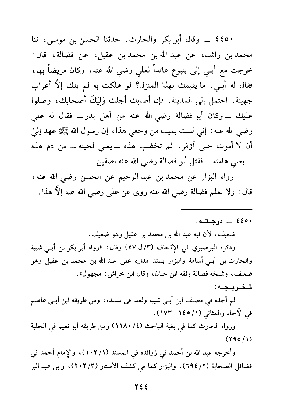 4450 - وقال أبو بكر والحارث: حدثنا الحسن بن موسى، ثنا محمد بن راشد، عن عبد الله بن محمد بن عقيل، عن فضالة، قال: خرجت مع أبي إلى ينبوع عائداً لعلي رَضِيَ الله عَنْه، وكان مريضاً بها، فقال له أبي. ما يقيمك بهذا المنزل؟ لو هلكت به لم يلك إلاَّ أعراب جهينة، احتمل إلى المدينة، فإن أصابك أجلك وَلِيَكَ أصحابك، وصلوا عليك - وكان أبو فضالة رَضِيَ الله عَنْه من أهل بدر - فقال له علي رَضِيَ الله عَنْه: إني لست بميت من وجعي هذا، إن رسول الله صَلَّى اللَّهُ عَلَيْهِ وَسَلَّمَ عهد إليَّ أن لا أموت حتى أؤمَر، ثم تخضب هذه - يعني لحيته - من دم هذه - يعني هامته - فقتل أبو فضالة رَضِيَ الله عَنْه بصفين.
