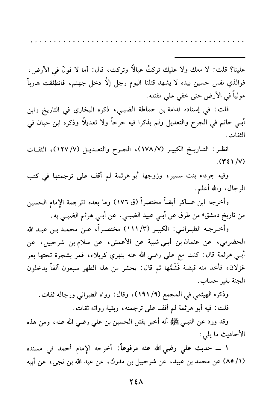 وأخرجه الطبراني: الكبير (3/ 111) مختصرًا، عن محمَّد بن عبد الله الحضرمي، عن عثمان بن أبي شيبة عن الأعمش، عن سلام بن شرحبيل، عن أبي هرثمة قال: كنت مع علي رضي الله عنه بنهري كربلاء، فمر بشجرة تحتها بعر غزلان، فأخذ منه قبضة فَشَمَّها ثم قال: يحشر من هذا الظهر سبعون ألفا يدخلون الجنة بغير حساب.