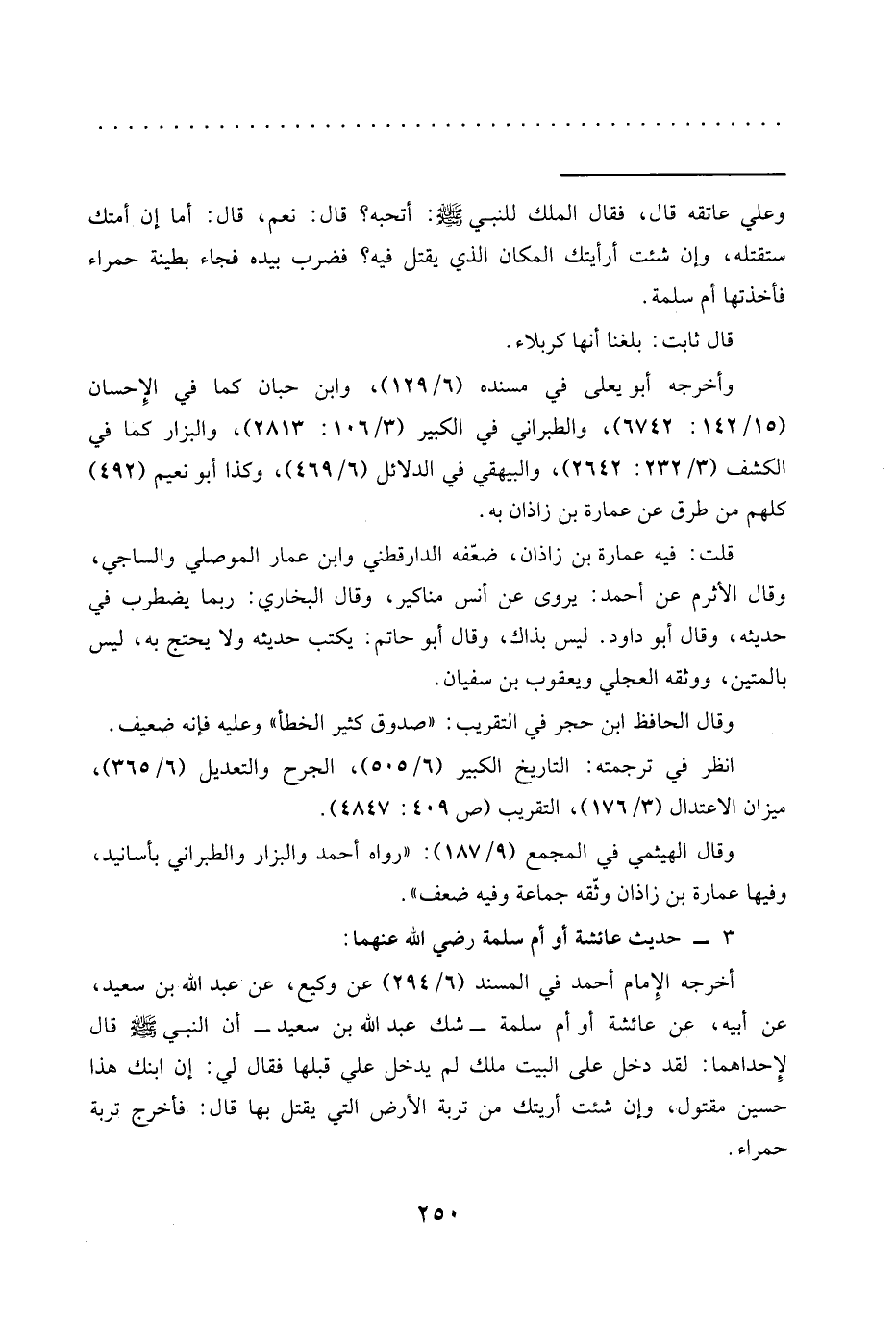 = وعلي عاتقه قال، فقال الملك للنبي: أتحبه؟ قال: نعم، قال: أما إن أمتك ستقتله، وإن شئت أرأيتك المكان الذي يقتل فيه؟ فضرب بيده فجاء بطينة حمراء فأخذتها أم سلمة.