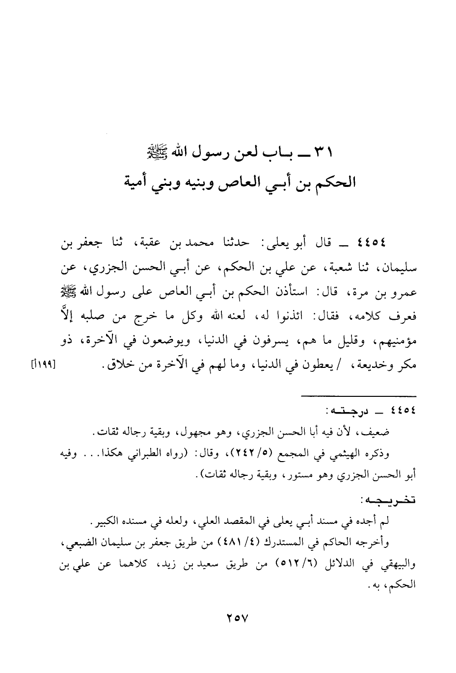 4454 - قَالَ أَبُو يَعْلَى: حَدَّثَنَا مُحَمَّدُ بْنُ عُقْبَةَ، ثنا جَعْفَرُ بْنُ سُلَيْمَانَ، ثنا شُعْبَةُ، عَنْ عَلِيِّ بْنِ الْحَكَمِ، عَنْ أَبِي الْحَسَنِ الْجَزَرِيِّ، عَنْ عَمْرِو بْنِ مُرَّةَ، قَالَ: اسْتَأْذَنَ الْحَكَمُ بْنُ أَبِي الْعَاصِ عَلَى رَسُولِ اللَّهِ صَلَّى اللَّهُ عَلَيْهِ وَسَلَّمَ فَعَرَفَ كَلَامَهُ، فَقَالَ: §ائْذَنُوا لَهُ، لَعَنَهُ اللَّهُ وَكُلَّ مَا خَرَجَ مِنْ صُلْبِهِ إِلَّا مؤمنيهم، وَقَلِيلٌ مَا هُمْ، يسرفون فِي الدُّنْيَا، وَيُوضَعُونَ في الآخرة، ذو مَكْرٍ وَخَدِيعَةٍ، يُعْطَوْنَ فِي الدُّنْيَا، وَمَا لَهُمْ فِي الْآخِرَةِ مِنْ خَلَاقٍ.