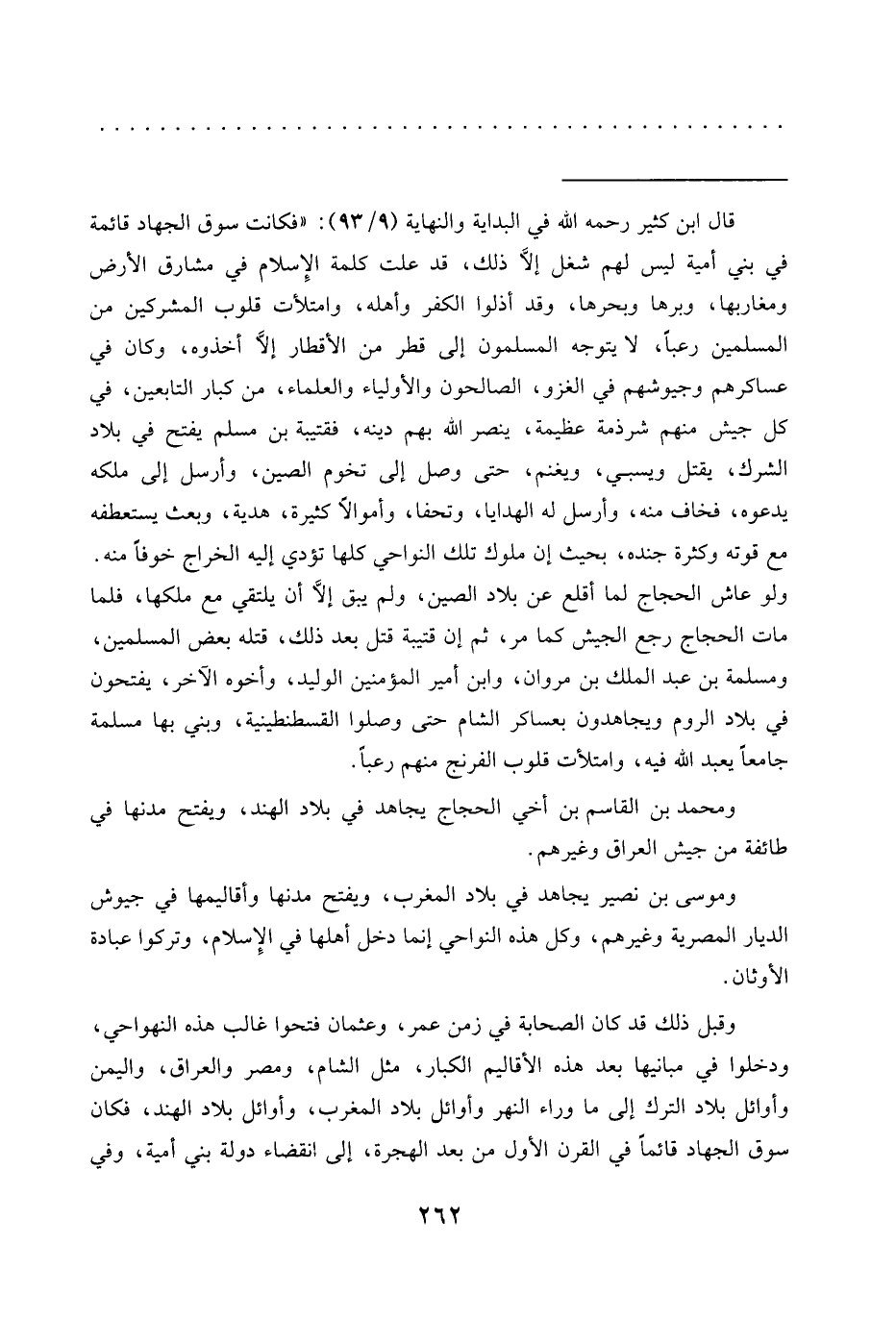 = قال ابن كثير رحمه الله في البداية والنهاية (9/ 93): "فكانت سوق الجهاد قائمة في بني أُمية ليس لهم شغل إلَّا ذلك، قد علت كلمة الإِسلام في مشارق الأرض ومغاربها، وبرها وبحرها، وقد أذلوا الكفر وأهله، وامتلأت قلوب المشركين من المسلمين رعبًا، لا يتوجه المسلمون إلى قطر من الأقطار إلَّا أخذوه، وكان في عساكرهم وجيوشهم في الغزو، الصالحون والأولياء والعلماء، من كبار التابعين، في كل جيش منهم شرذمة عظيمة، ينصر الله بهم دينه، فقتيبة بن مسلم يفتح في بلاد الشرك، يقتل ويسبي، ويغنم، حتى وصل إلى تخوم الصين، وأرسل إلى ملكه يدعوه، فخاف منه، وأرسل له الهدايا، وتحفا، وأموالًا كثيرة، هدية، وبعث يستعطفه مع قوته وكثرة جنده، بحيث إن ملوك تلك النواحي كلها تؤدي إليه الخراج خوفًا منه.