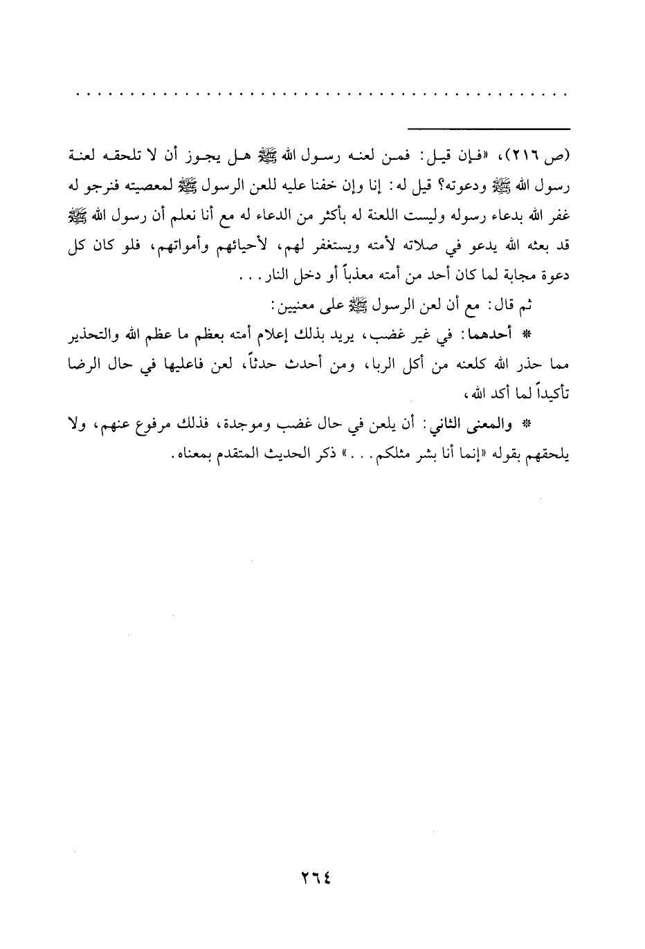 = (ص 216)، "فإن قيل: فمن لعنه رَسُولُ اللَّهِ -صَلَّى اللَّهُ عَلَيْهِ وَسَلَّمَ- هَلْ يجوز أن لا تلحقه لعنة رسول الله -صلى الله عليه وسلم- ودعوته؟ قيل له: إنا وإن خفنا عليه للعن الرسول -صلى الله عليه وسلم- لمعصيته فنرجو له غفر الله بدعاء رسوله وليست اللعنة له بأكثر من الدعاء له مع أنا نعلم أن رسول الله -صلى الله عليه وسلم- قد بعثه الله يدعو في صلاته لأمته ويستغفر لهم، لأحيائهم وأمواتهم، فلو كان كل دعوة مجابة لما كان أحد من أمته معذبًا أو دخل النار ...