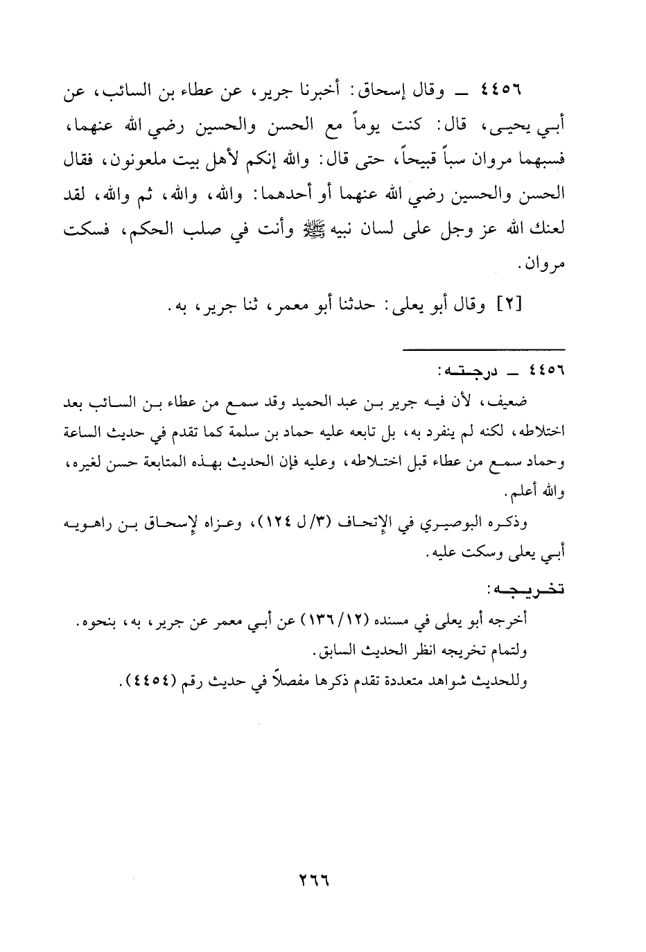 [2] وَقَالَ أَبُو يَعْلَى: حَدَّثَنَا أَبُو مَعْمَرٍ، ثنا جَرِيرٌ، بِهِ.