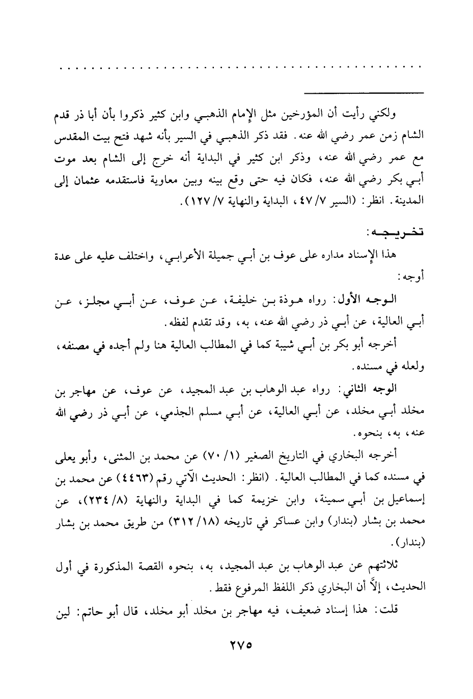 = ولكني رأيت أن المؤرخين مثل الإِمام الذهبي وابن كثير ذكروا بأن أبا ذر قدم الشام زمن عمر رضي الله عنه. فقد ذكر الذهبي في السير بأنه شهد فتح بيت المقدس مع عمر رضي الله عنه، وذكر ابن كثير في البداية أنه خرج إلى الشام بعد موت أبي بكر رضي الله عنه، فكان فيه حتى وقع بينه وبين معاوية فاستقدمه عثمان إلى المدينة. انظر: (السير 7/ 47، البداية والنهاية 7/ 127).