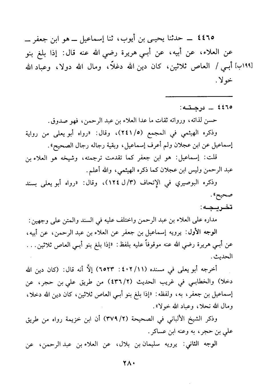 4465 - حَدَّثَنَا يَحْيَى بْنُ أَيُّوبَ، ثنا إِسْمَاعِيلُ - هُوَ ابْنُ جَعْفَرٍ - عَنِ الْعَلَاءِ، عَنْ أَبِيهِ، عَنْ أَبِي هُرَيْرَةَ رَضِيَ الله عَنْه قَالَ: §إِذَا بَلَغَ بَنُو أَبِي الْعَاصِ ثَلَاثِينَ، كَانَ دَيْنُ اللَّهِ دَغَلًا، وَمَالُ اللَّهِ دِوَلًا، وَعِبَادُ اللَّهِ خَوَلًا -[284]-.