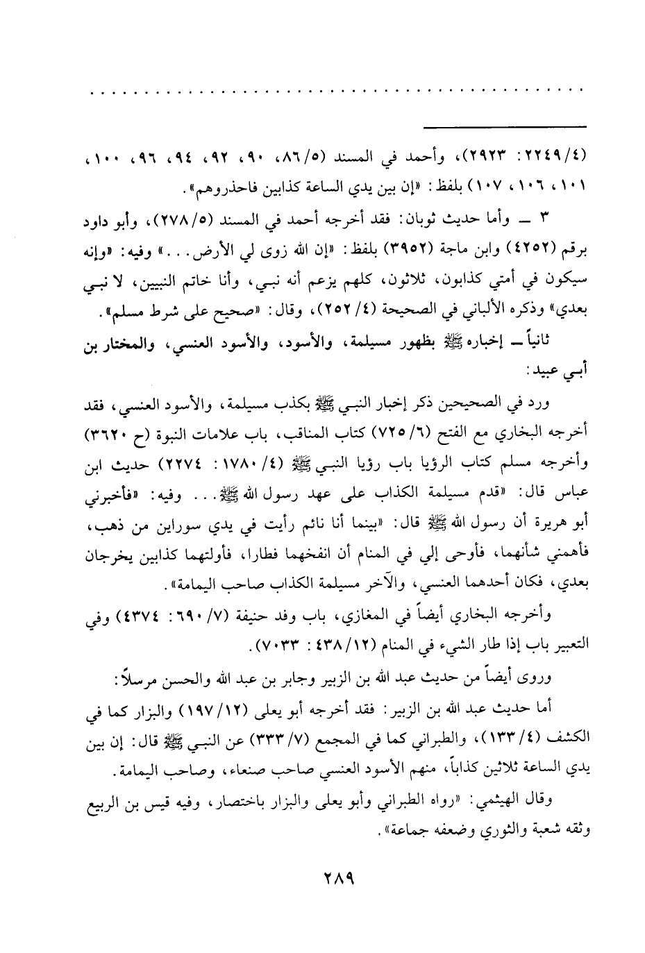 ثانيًا- إخباره -صلى الله عليه وسلم- بظهور مسيلمة، والأسود، والأسود العنسي، والمختار بن أبي عبيد: ورد في الصحيحين ذكر إخبار النبي -صلى الله عليه وسلم- بكذب مسيلمة، والأسود العنسي، فقد أخرجه البخاري مع الفتح (6/ 725) كتاب المناقب، باب علامات النبوة (ح 3620) وأخرجه مسلم كتاب الرؤيا باب رؤيا النبي -صلى الله عليه وسلم- (4/ 1780: 2274) حديث ابن عباس قال: "قدم مسيلمة الكذاب عَلَى عَهْدِ رَسُولِ اللَّهِ -صَلَّى اللَّهُ عَلَيْهِ وسلم- ... وفيه: "فأخبرني أبو هُرَيْرَةَ أَنَّ رَسُولَ اللَّهِ -صَلَّى اللَّهُ عَلَيْهِ وسلم- قال: "بينما أنا نائم رأيت في يدي سوراين من ذهب، فأهمني شأنهما، فأوحى إلي في المنام أن انفخهما فطارا، فأولتهما كذابين يخرجان بعدي، فكان أحدهما العنسي، والآخر مسيلمة الكذاب صاحب اليمامة".