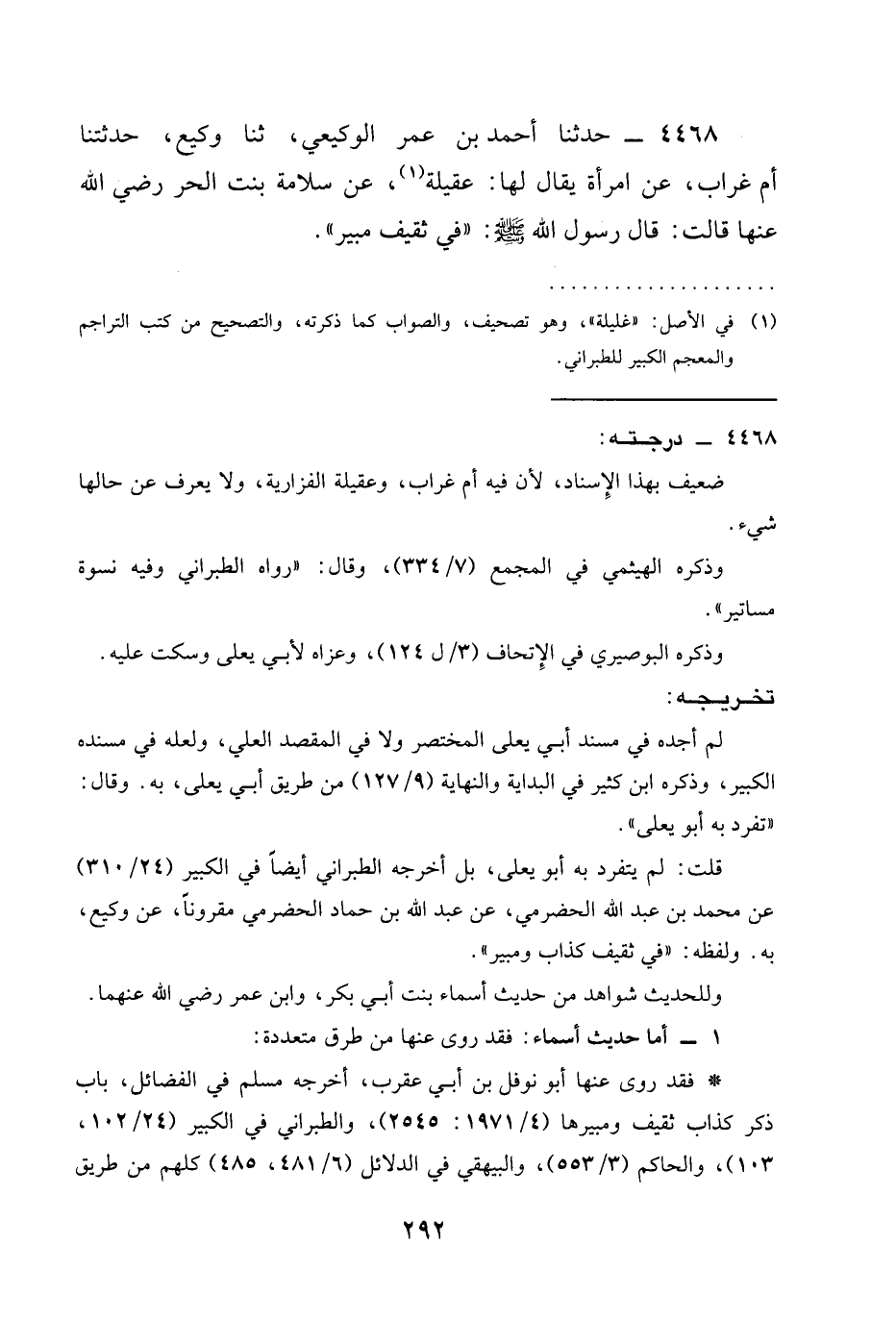 4468 - حَدَّثَنَا أَحْمَدُ بْنُ عُمَرَ الْوَكِيعِيُّ، ثنا وَكِيعٌ، حَدَّثَتْنَا أُمُّ غُرَابٍ، عَنِ امْرَأَةٍ يُقَالُ لَهَا: عَقِيلَةُ، عَنْ سَلَّامَةَ بنت الحر رَضِيَ الله عَنْها قَالَتْ: قَالَ رَسُولُ اللَّهِ صَلَّى اللَّهُ عَلَيْهِ وَسَلَّمَ: " §فِي ثَقِيفٍ مُبِيرٌ ".