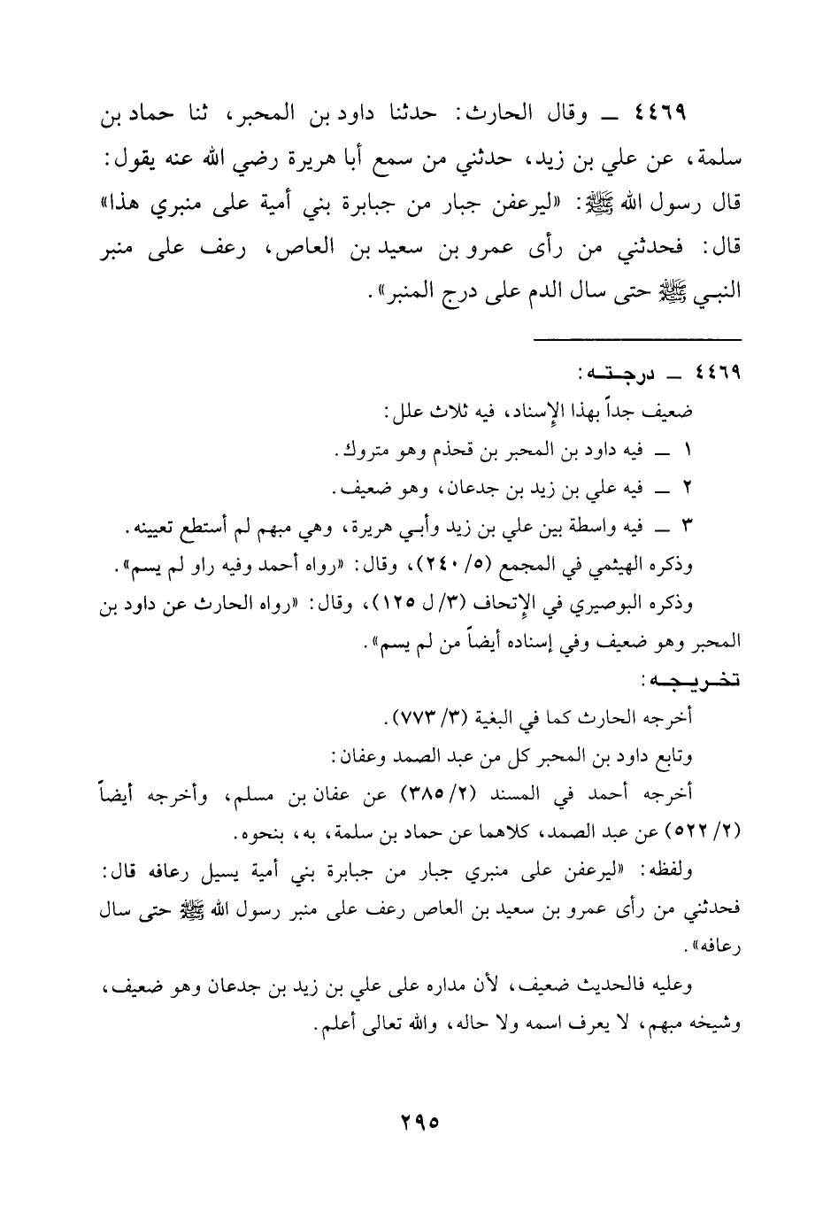 4469 - وَقَالَ الْحَارِثُ: حَدَّثَنَا دَاوُدُ بْنُ الْمُحَبَّرِ، ثنا حَمَّادُ بْنُ سَلَمَةَ، عَنْ عَلِيِّ بْنِ زَيْدٍ، حَدَّثَنِي مَنْ سَمِعَ أَبَا هُرَيْرَةَ رَضِيَ الله عَنْه يَقُولُ: قَالَ رَسُولُ اللَّهِ صَلَّى اللَّهُ عَلَيْهِ وَسَلَّمَ: " §لَيَرْعَفَنَّ جَبَّارٌ مِنْ جَبَابِرَةِ بَنِي أُمَيَّةَ عَلَى مِنْبَرِي هَذَا " قَالَ: فَحَدَّثَنِي مَنْ رَأَى عَمْرَو بْنَ سَعِيدِ بْنِ الْعَاصِ، رَعَفَ عَلَى مِنْبَرِ النَّبِيِّ صَلَّى اللَّهُ عَلَيْهِ وَسَلَّمَ حَتَّى سَالَ الدَّمُ عَلَى دَرَجِ الْمِنْبَرِ ".