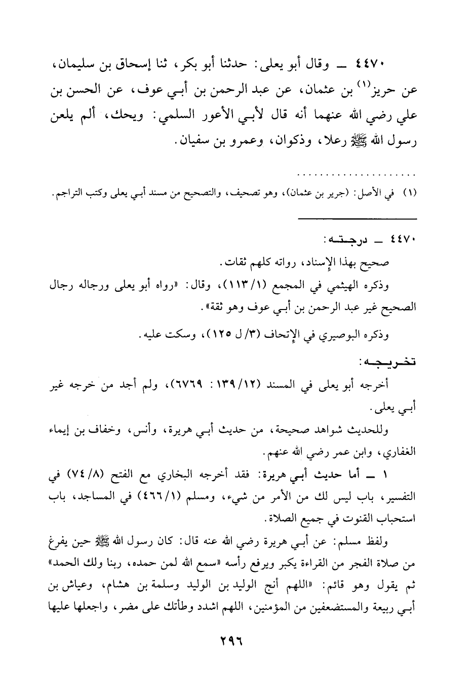 4470 - وَقَالَ أَبُو يَعْلَى: حَدَّثَنَا أَبُو بَكْرٍ، ثنا إِسْحَاقُ بْنُ سُلَيْمَانَ، عَنْ حَرِيزِ بْنِ عُثْمَانَ، عَنْ عَبْدِ الرَّحْمَنِ بْنِ أَبِي عَوْفٍ، عَنِ الْحَسَنِ بن علي رَضِيَ الله عَنْهما أَنَّهُ قَالَ لِأَبِي الْأَعْوَرِ السُّلَمِيِّ: وَيْحَكَ، §أَلَمْ يَلْعَنْ رَسُولُ اللَّهِ صَلَّى اللَّهُ عَلَيْهِ وَسَلَّمَ رِعْلًا، وَذَكْوَانَ، وَعَمْرَو بْنَ سُفْيَانَ.