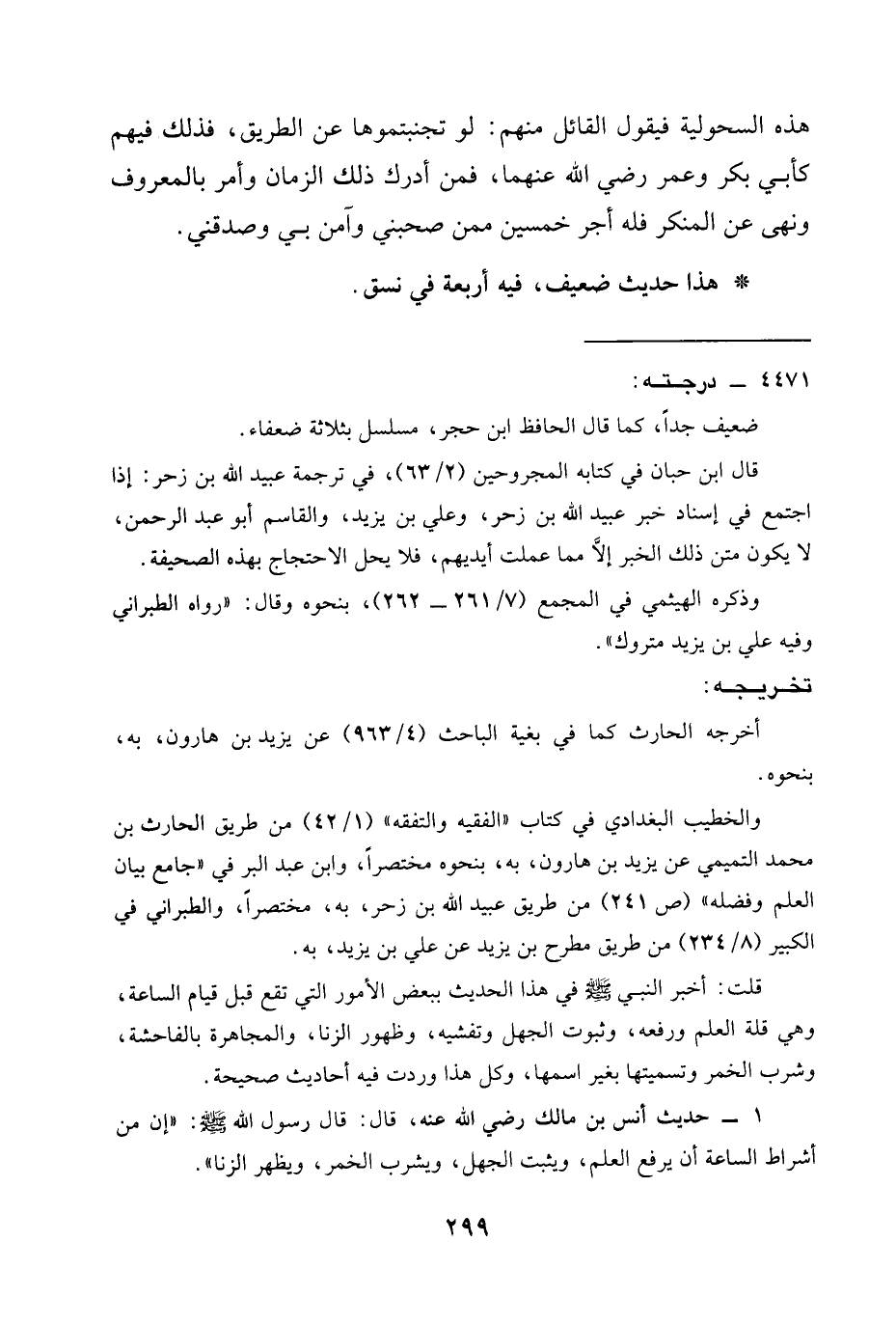 والخطيب البغدادي في كتاب "الفقيه والمتفقه" (1/ 42) من طريق الحارث بن محمَّد التميمي عن يزيد بن هارون، به، بنحوه مختصرًا، وابن عبد البر في "جامع بيان العلم وفضله" (ص 241) من طريق عبيد الله بن زحر، به، مختصرًا، والطبراني في الكبير (8/ 234) من طريق مطرح بن يزيد عن علي بن يزيد، به.