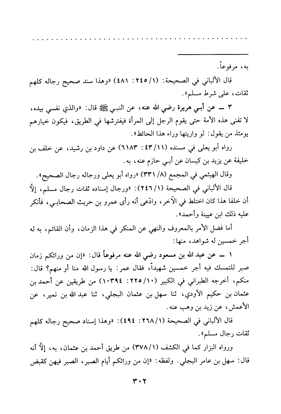 1 - عَنْ عَبْدِ اللَّهِ بْنِ مَسْعُودٍ رَضِيَ اللَّهُ عنه مرفوعًا قال: "إن من ورائكم زمان صبر للتمسك فيه أجر خمسين شهيدًا، فقال عمر: يا رسول الله -صلى الله عليه وسلم- منا أو منهم؟ قال: منكم، أخرجه الطبراني في الكبير (10/ 225: 10394) من طريقين عن أحمد بن عثمان بن حكيم الأودي، ثنا سهل بن عثمان البجلي، ثنا عبد الله بن نمير، عن الأعمش، عن زيد بن وهب عنه.