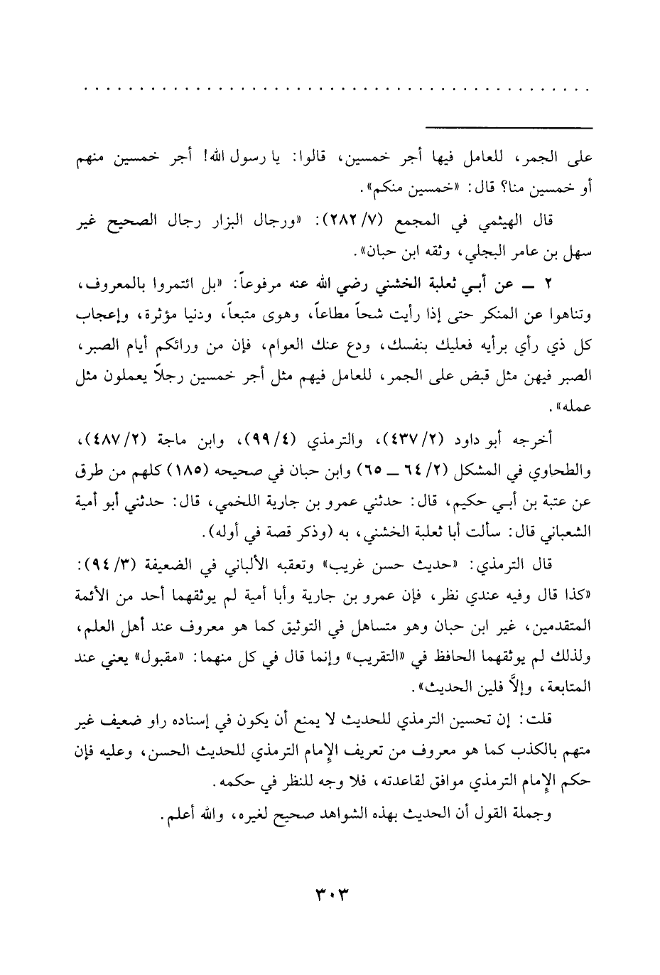 2 - عَنْ أَبِي ثَعْلَبَةَ الْخُشَنِيِّ رَضِيَ اللَّهُ عَنْهُ مرفوعًا: "بل ائتمروا بالمعروف، وتناهوا عن المنكر حتى إذا رأيت شحًا مطاعًا، وهوى متبعًا، ودنيا مؤثرة، وإعجاب كل ذي رأي برأيه فعليك بنفسك، ودع عنك العوام، فإن من ورائكم أيام الصبر، الصبر فيهن مثل قبض على الجمر، للعامل فيهم مثل أجر خمسين رجلًا يعملون مثل عمله".