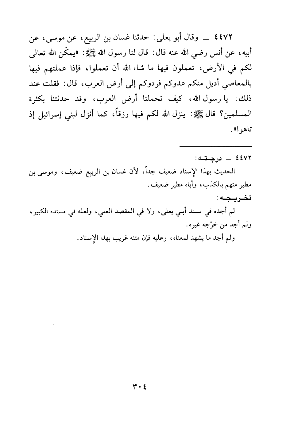 4472 - وَقَالَ أَبُو يَعْلَى: حَدَّثَنَا غَسَّانُ بْنُ الرَّبِيعِ، عَنْ مُوسَى، عَنْ أَبِيهِ، عَنْ أَنَسٍ رَضِيَ الله عَنْه قَالَ: قَالَ لَنَا رَسُولُ اللَّهِ صَلَّى اللَّهُ عَلَيْهِ وَسَلَّمَ: " §يمكّن الله تعالى لَكُمْ فِي الْأَرْضِ، تَعْمَلُونَ فِيهَا مَا شَاءَ اللَّهُ أَنْ تَعْمَلُوا، فَإِذَا عملتهم فِيهَا بِالْمَعَاصِي أُدِيلَ مِنْكُمْ عَدُوُّكُمْ فَرَدُّوكُمْ إِلَى أَرْضِ الْعَرَبِ، قَالَ: فَقُلْتُ عِنْدَ ذَلِكَ: يَا رَسُولَ اللَّهِ، كَيْفَ تَحْمِلُنَا أَرْضُ الْعَرَبِ، وَقَدْ حَدَّثَتْنَا بِكَثْرَةِ الْمُسْلِمِينَ؟ قَالَ صَلَّى اللَّهُ عَلَيْهِ وَسَلَّمَ: يُنَزِّلُ اللَّهُ لَكُمْ فِيهَا رِزْقًا، كَمَا أَنْزَلَ لِبَنِي إِسْرَائِيلَ إِذْ تَاهُوا ".