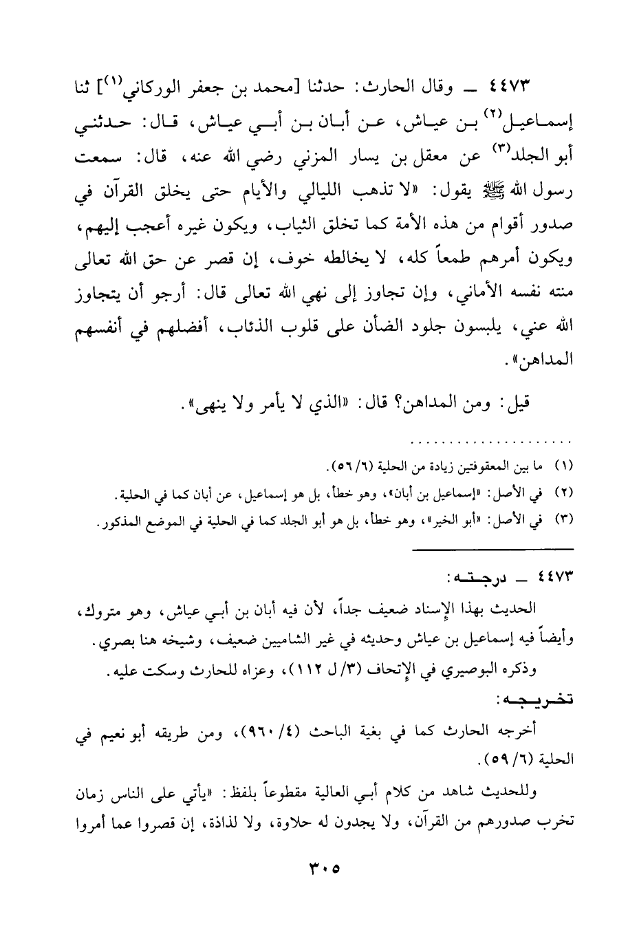 4473 - وقَالَ الْحَارِثُ: حَدَّثَنَا [محمد بن جعفر الوركاني] ثنا إِسْمَاعِيلُ بْنُ عياش، عن أبان بن أبي عياش، قال: حدثني أبو الجلد عَنْ مَعْقِلِ بْنِ يَسَارٍ الْمُزَنِيِّ رَضِيَ الله عَنْه، قَالَ: سَمِعْتُ رَسُولَ اللَّهِ صَلَّى اللَّهُ عَلَيْهِ وَسَلَّمَ يَقُولُ: " §لَا تَذْهَبُ اللَّيَالِي وَالْأَيَّامُ حَتَّى يَخْلَقَ الْقُرْآنُ فِي صُدُورِ أَقْوَامٍ مِنْ هَذِهِ الْأُمَّةِ كَمَا تَخْلَقُ الثِّيَابُ، وَيَكُونُ غَيْرُهُ أَعْجَبَ إِلَيْهِمْ، وَيَكُونُ أَمَرُهُمْ طَمَعًا كُلُّهُ، لَا يُخَالِطُهُ خَوْفٌ، إِنْ قَصَّرَ عَنْ حَقِّ اللَّهِ تَعَالَى مَنَّتْهُ نَفْسُهُ الْأَمَانِيَّ، وَإِنْ تَجَاوَزَ إِلَى نَهْيِ اللَّهِ تَعَالَى قَالَ: أَرْجُو أَنْ يَتَجَاوَزَ اللَّهُ عَنِّي، يَلْبَسُونَ جُلُودَ الضَّأْنِ عَلَى قُلُوبِ الذِّئَابِ، أَفْضَلُهُمْ فِي أَنْفُسِهِمُ المداهن ".