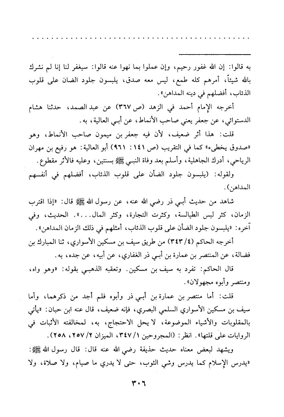 شاهد من حديث أَبِي ذَرٍّ رَضِيَ اللَّهُ عَنْهُ، عَنْ رَسُولِ اللَّهِ -صَلَّى اللَّهُ عَلَيْهِ وَسَلَّمَ- قَالَ: "إِذَا اقترب الزمان، كثر لبس الطيالسة، وكثرت التجارة، وكثر المال ... ". الحديث، وفي آخره: "يلبسون جلود الضأن على قلوب الذئاب، أمثلهم في ذلك الزمان المداهن".