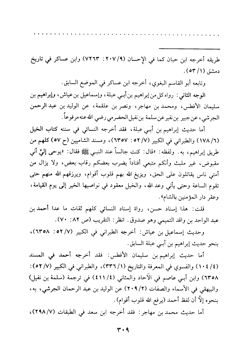 أما حديث إبراهيم بن أبي عبلة، فقد أخرجه النسائي في سننه كتاب الخيل (6/ 178) والطبراني في الكبير (7/ 52: 6357)، ومسند الشاميين (ح 57) كلهم من طريق إبراهيم، به. ولفظه: "قَالَ: كُنْتُ جَالِسًا عِنْدَ النَّبِيِّ -صَلَّى اللَّهُ عليه وسلم- فقال: "يوحى إليَّ أني مقبوض، غير ملبث وأنكم متبعي أفنادًا يضرب بعضكم رقاب بعض، ولا يزال من أمتي ناس يقاتلون على الحق، ويزيغ الله بهم قلوب أقوام، ويرزقهم الله منهم حتى تقوم الساعة وحتى يأتي وعد الله، والخيل مَعْقُودٌ فِي نَوَاصِيهَا الْخَيْرُ إِلَى يَوْمِ الْقِيَامَةِ، وعقر دار المؤمنين بالشام".