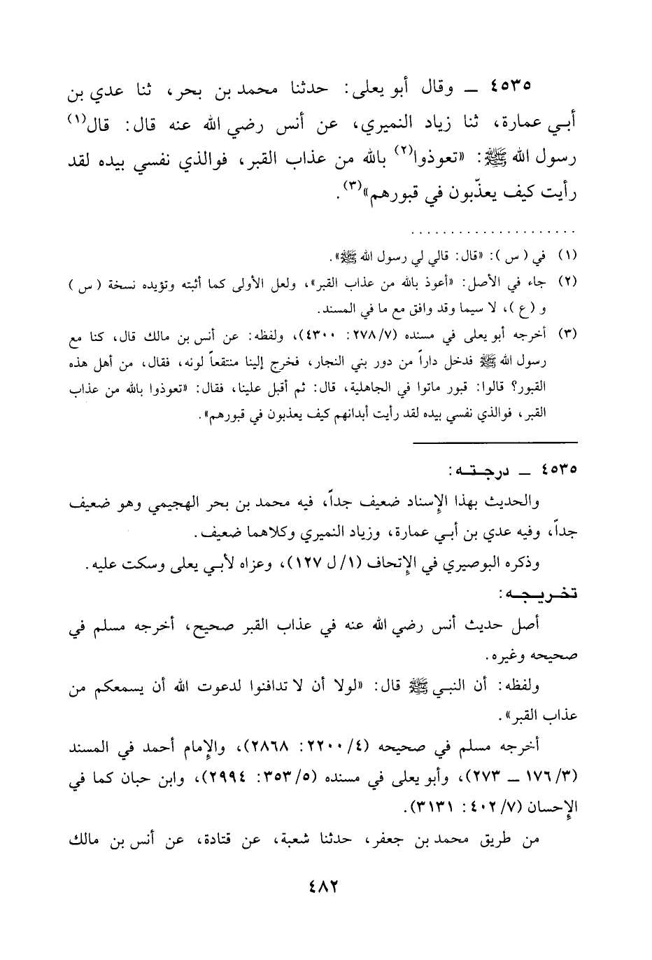 4535 - وَقَالَ أَبُو يَعْلَى: حَدَّثَنَا مُحَمَّدُ بْنُ بَحْرٍ، ثنا عَدِيُّ بْنُ أَبِي عُمَارَةَ، ثنا زِيَادٌ النُّمَيْرِيُّ، عَنْ أَنَسٍ رَضِيَ الله عَنْه قَالَ: قَالَ رَسُولُ اللَّهِ صَلَّى اللَّهُ عَلَيْهِ وَسَلَّمَ: " §تَعَوَّذُوا بِاللَّهِ مِنْ عَذَابِ الْقَبْرِ، فَوَالَّذِي نَفْسِي بِيَدِهِ لَقَدْ رَأَيْتُ كَيْفَ يُعَذَّبُونَ فِي قُبُورِهِمْ ".