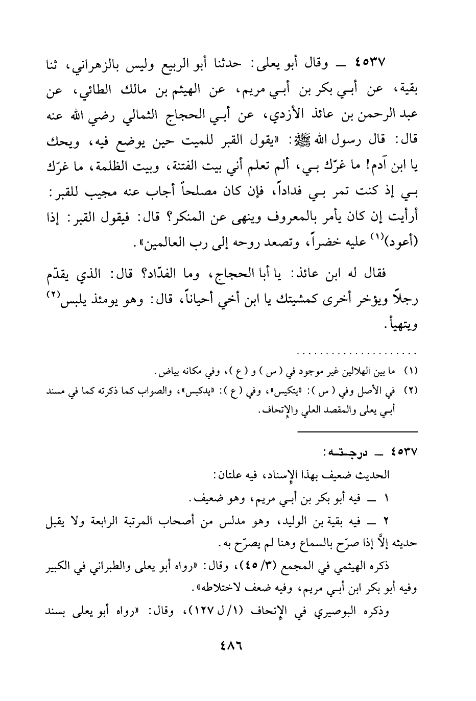 4537 - وَقَالَ أَبُو يَعْلَى: حَدَّثَنَا أَبُو الرَّبِيعِ وَلَيْسَ بِالزَّهْرَانِيِّ، ثنا بَقِيَّةُ، عَنْ أَبِي بَكْرِ بْنِ أَبِي مَرْيَمَ، عَنِ الْهَيْثَمِ بْنِ مَالِكٍ الطَّائِيِّ، عَنْ عَبْدِ الرَّحْمَنِ بْنِ عَائِذٍ الْأَزْدِيِّ، عَنْ أَبِي الْحَجَّاجِ الثُّمَالِيِّ رَضِيَ الله عَنْه قَالَ: قَالَ رَسُولُ اللَّهِ صَلَّى اللَّهُ عَلَيْهِ وَسَلَّمَ: " يَقُولُ الْقَبْرُ لِلْمَيِّتِ حِينَ يُوضَعُ فِيهِ، وَيْحَكَ يَا ابْنَ آدَمَ! §مَا غَرَّكَ بِي، أَلَمْ تَعْلَمْ أَنِّي بَيْتُ الْفِتْنَةِ، وَبَيْتُ الظُّلْمَةِ، مَا غَرَّكَ بِي إِذْ كُنْتَ تَمُرُ بِي فَدَّادًا، فَإِنْ كان مصلحاً أجاب عَنْهُ مُجِيبُ للقبر: أَرَأَيْتَ إِنْ كَانَ يَأْمُرُ بِالْمَعْرُوفِ وَيَنْهَى عَنِ الْمُنْكَرِ؟ قَالَ: فَيَقُولُ الْقَبْرُ: إِذًا (أَعُودُ) عَلَيْهِ خَضِرًا، وَتَصْعَدُ رُوحُهُ إِلَى رَبِّ الْعَالَمِينَ ".