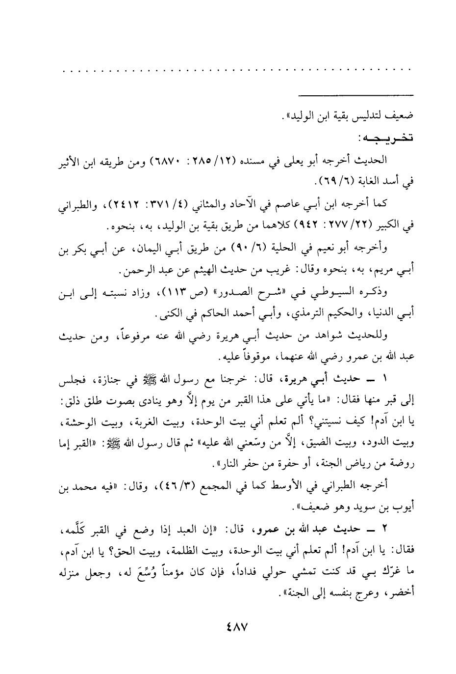 وذكره السيوطي في "شرح الصدور" (ص 113)، وزاد نسبته إلى ابن أبي الدنيا، والحكيم الترمذي، وأبي أحمد الحاكم في الكنى.