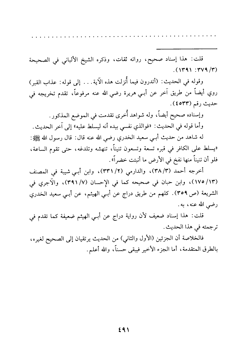 أخرجه أحمد (3/ 38)، والدارمي (2/ 331)، وابن أبي شيبة في المصنف (13/ 175)، وابن حبّان في صحيحه كما في الإِحسان (7/ 391)، والآجري في الشريعة (ص 359). كلهم من طريق دَرَّاجٍ عَنْ أَبِي الْهَيْثَمِ، عَنْ أَبِي سَعِيدٍ الخدري رضي الله عنه، به.
